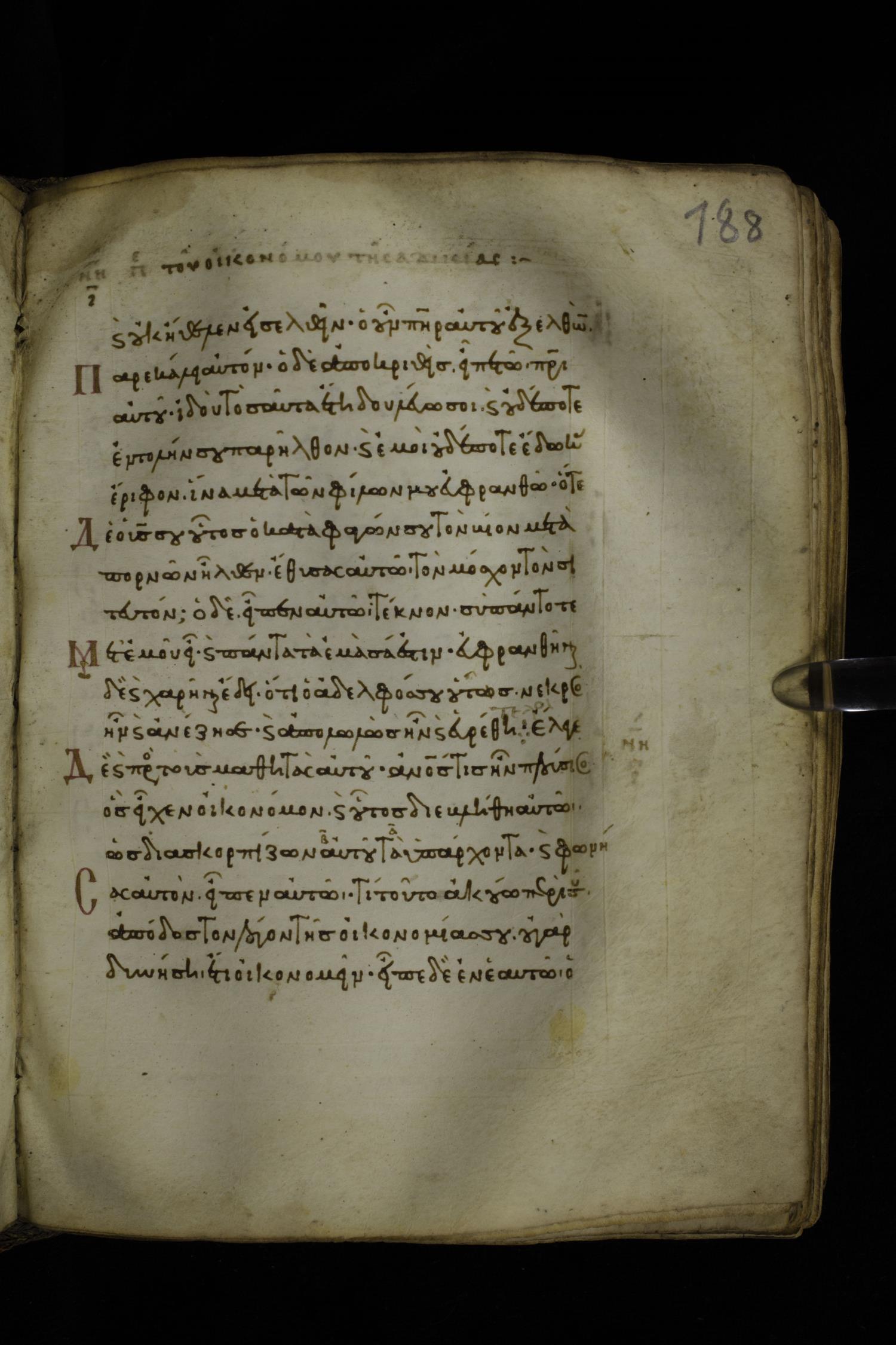 Eleventh century minuscule of the Gospels with commentary on parchment; 289 leaves, single column, 15-17 lines per column. Images were taken at the Hellenic Parliament Library in Athens.