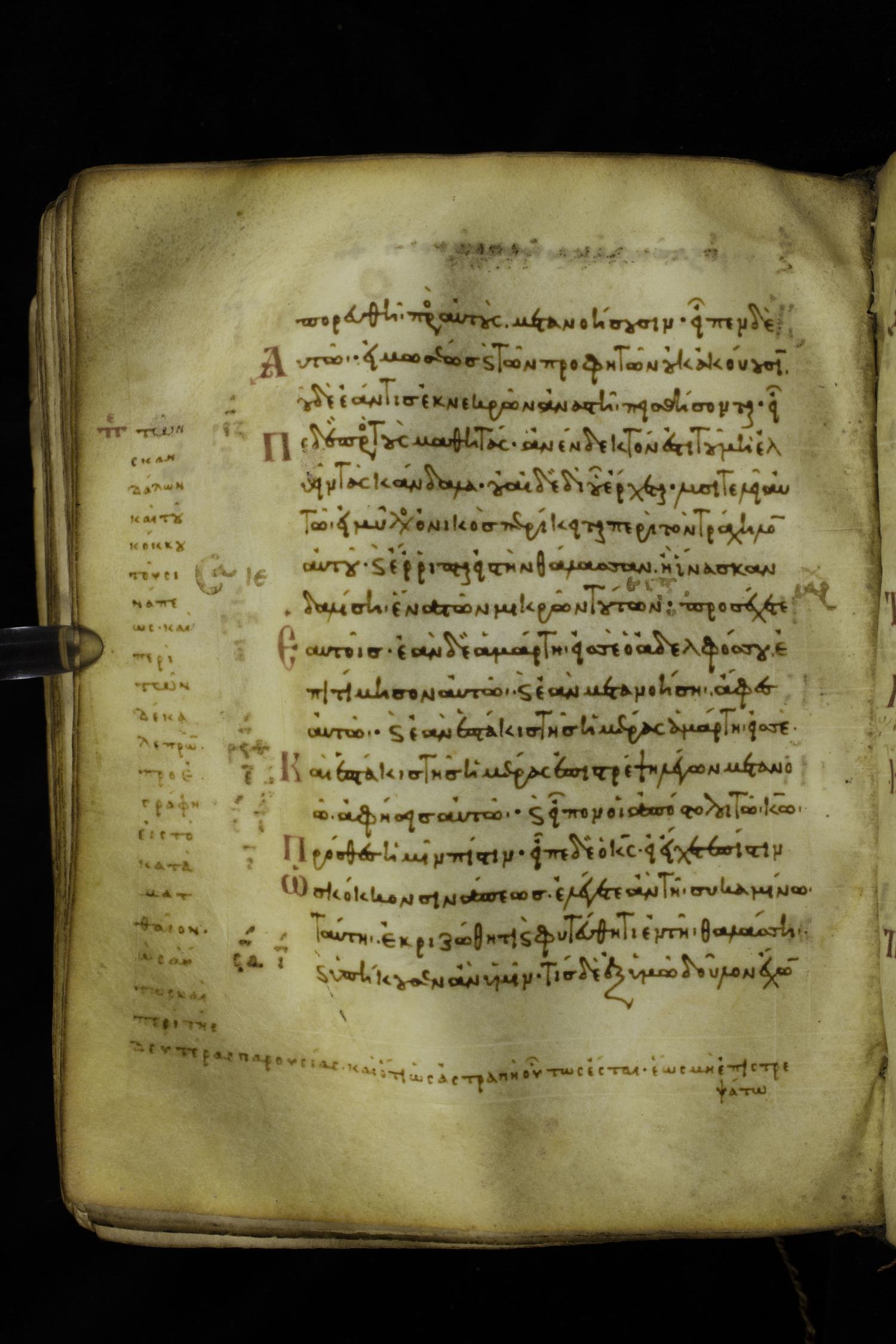 Eleventh century minuscule of the Gospels with commentary on parchment; 289 leaves, single column, 15-17 lines per column. Images were taken at the Hellenic Parliament Library in Athens.