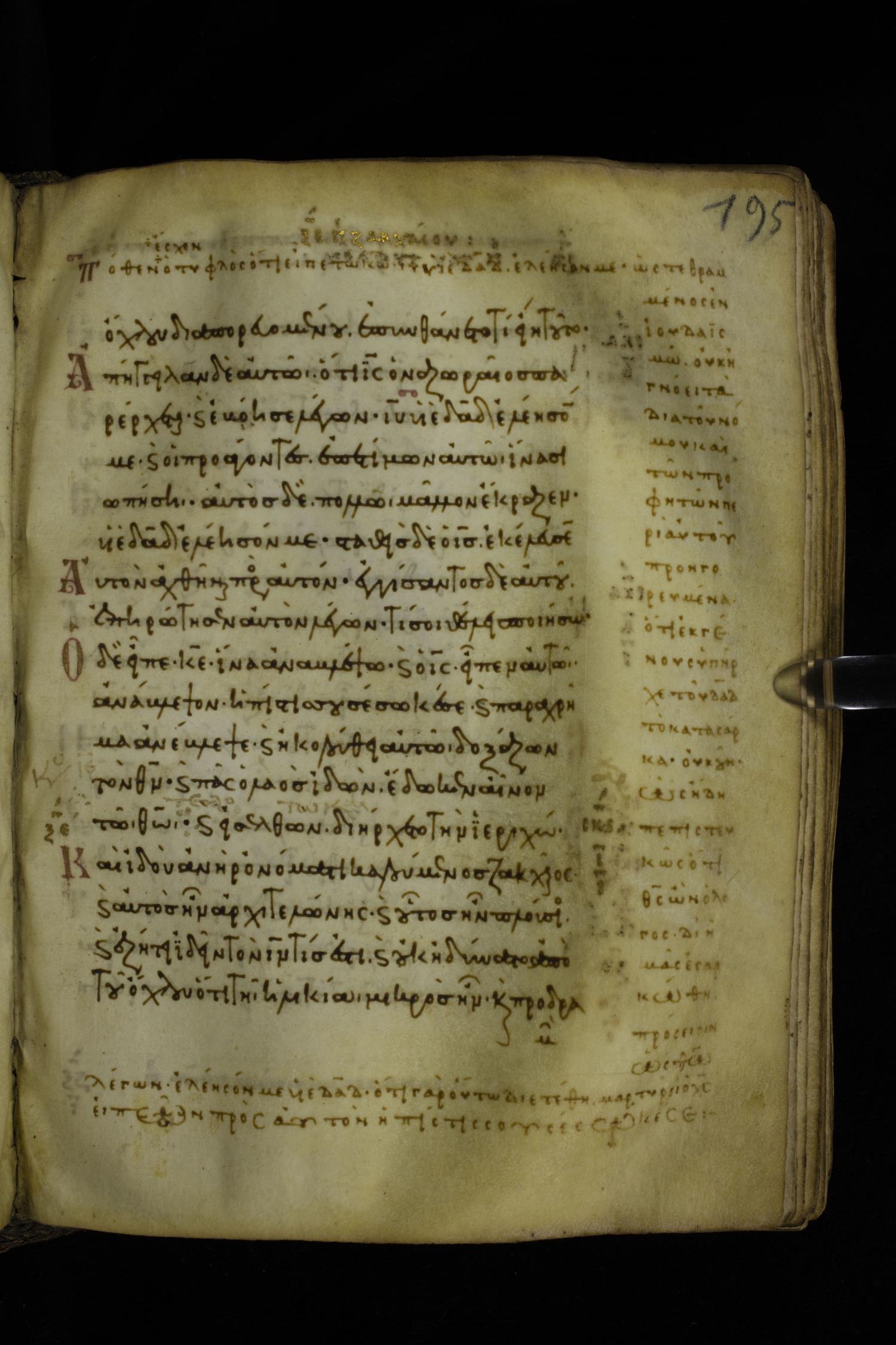 Eleventh century minuscule of the Gospels with commentary on parchment; 289 leaves, single column, 15-17 lines per column. Images were taken at the Hellenic Parliament Library in Athens.