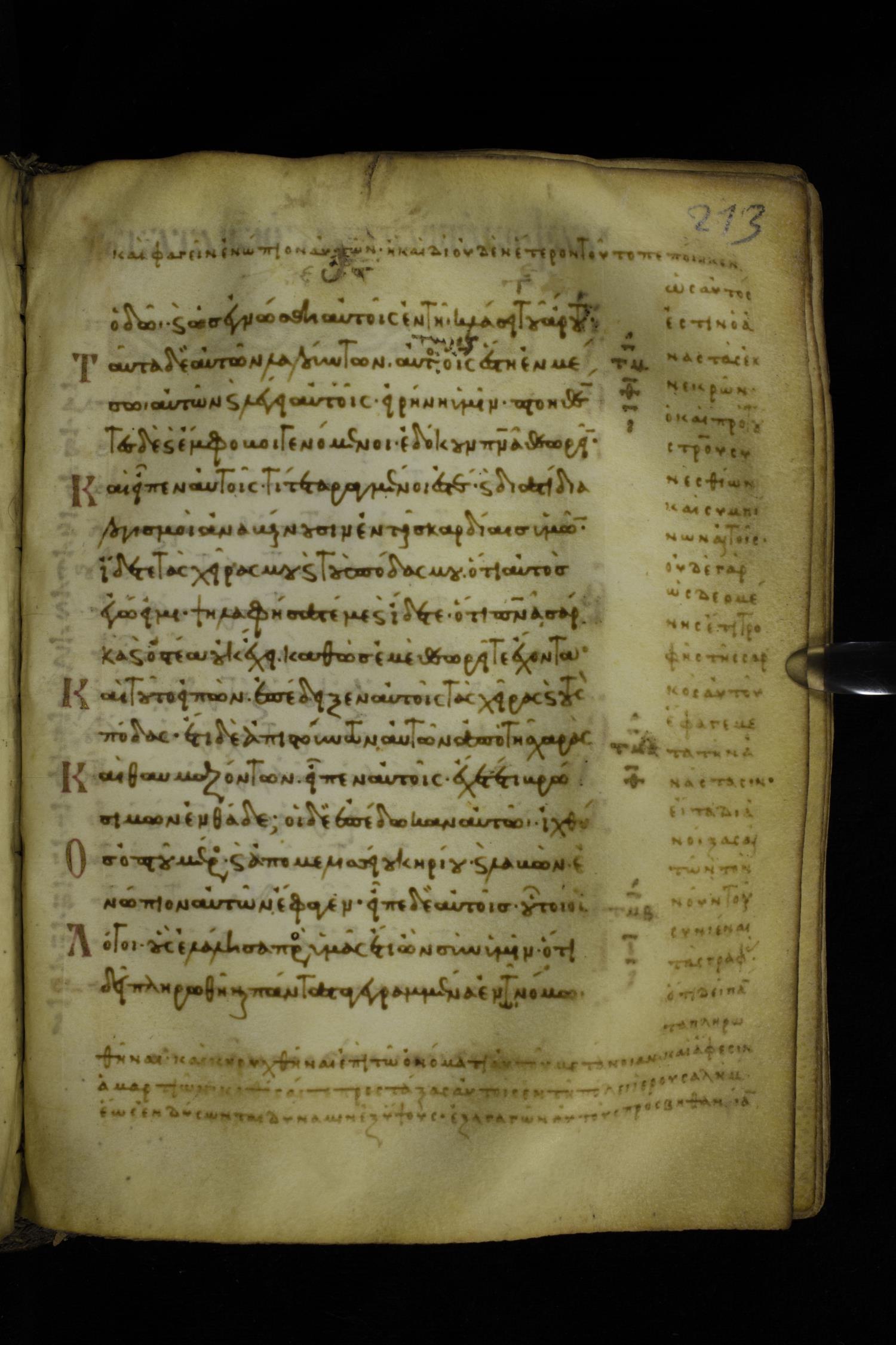 Eleventh century minuscule of the Gospels with commentary on parchment; 289 leaves, single column, 15-17 lines per column. Images were taken at the Hellenic Parliament Library in Athens.