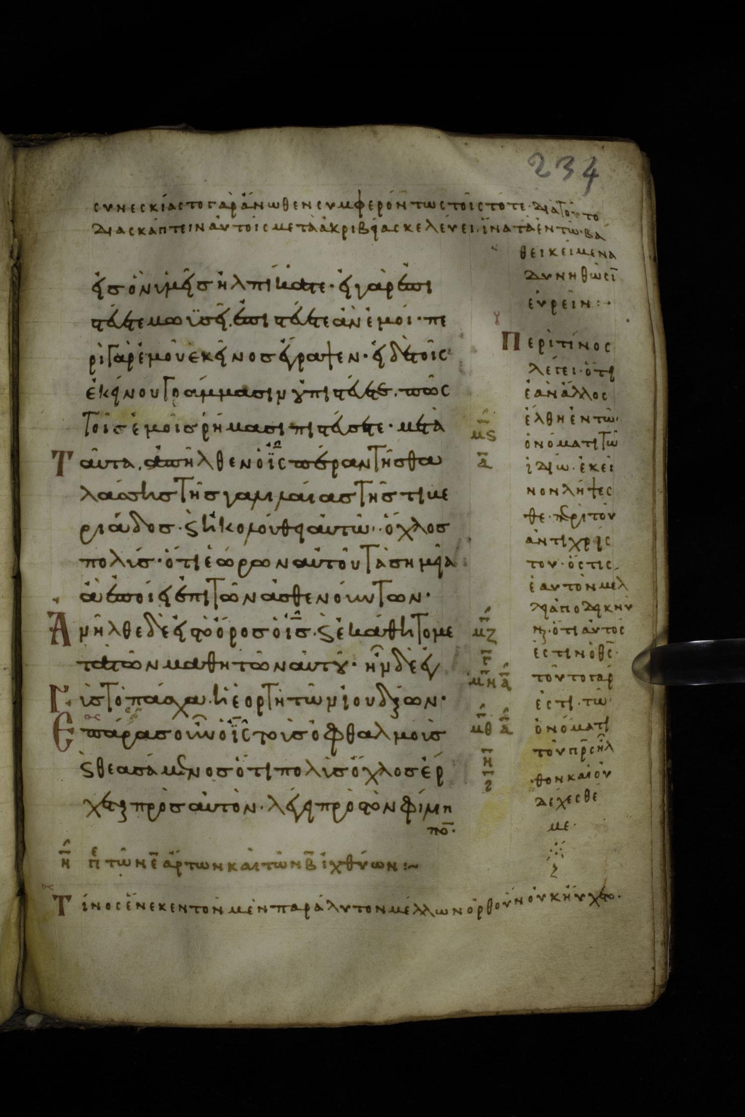Eleventh century minuscule of the Gospels with commentary on parchment; 289 leaves, single column, 15-17 lines per column. Images were taken at the Hellenic Parliament Library in Athens.