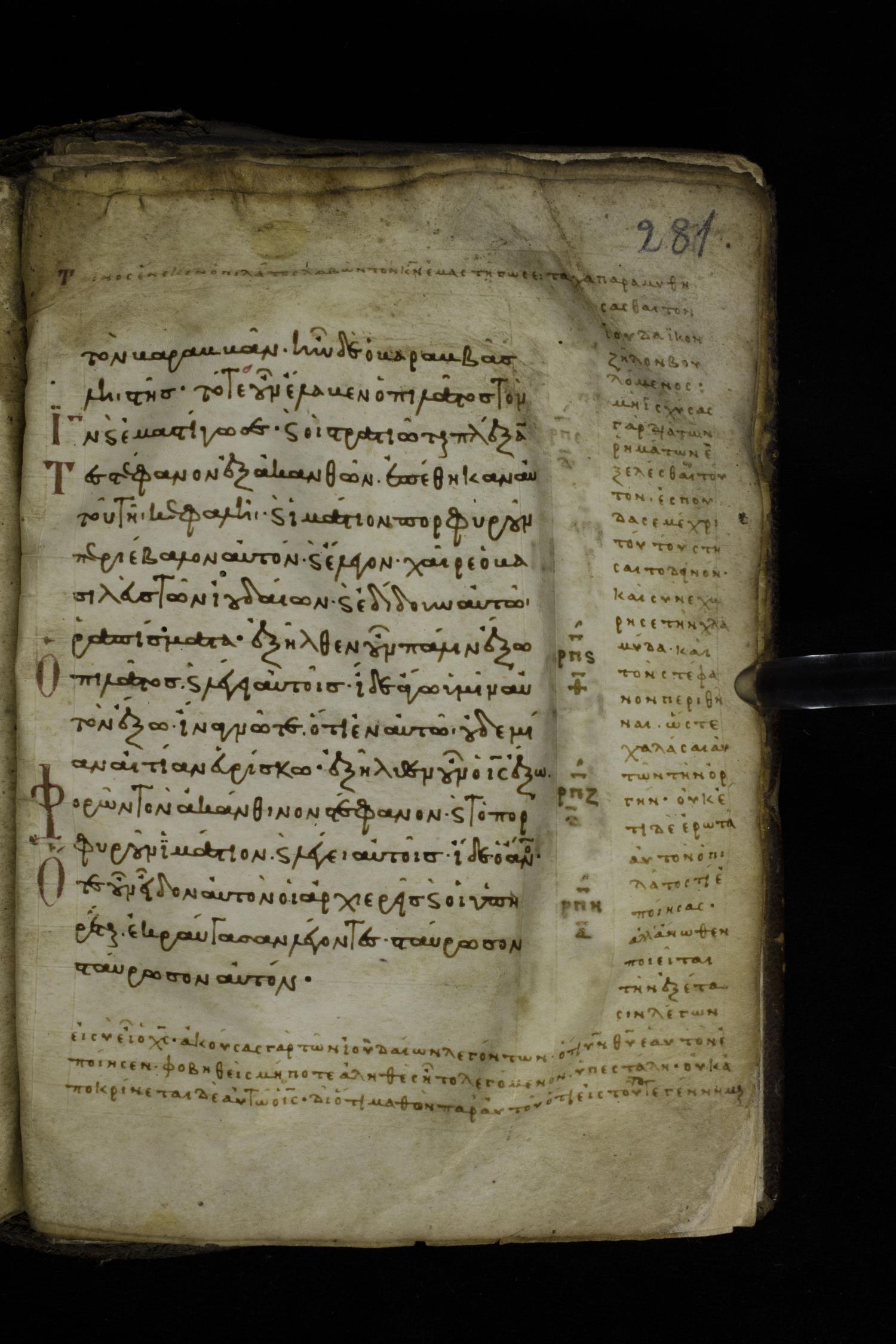Eleventh century minuscule of the Gospels with commentary on parchment; 289 leaves, single column, 15-17 lines per column. Images were taken at the Hellenic Parliament Library in Athens.