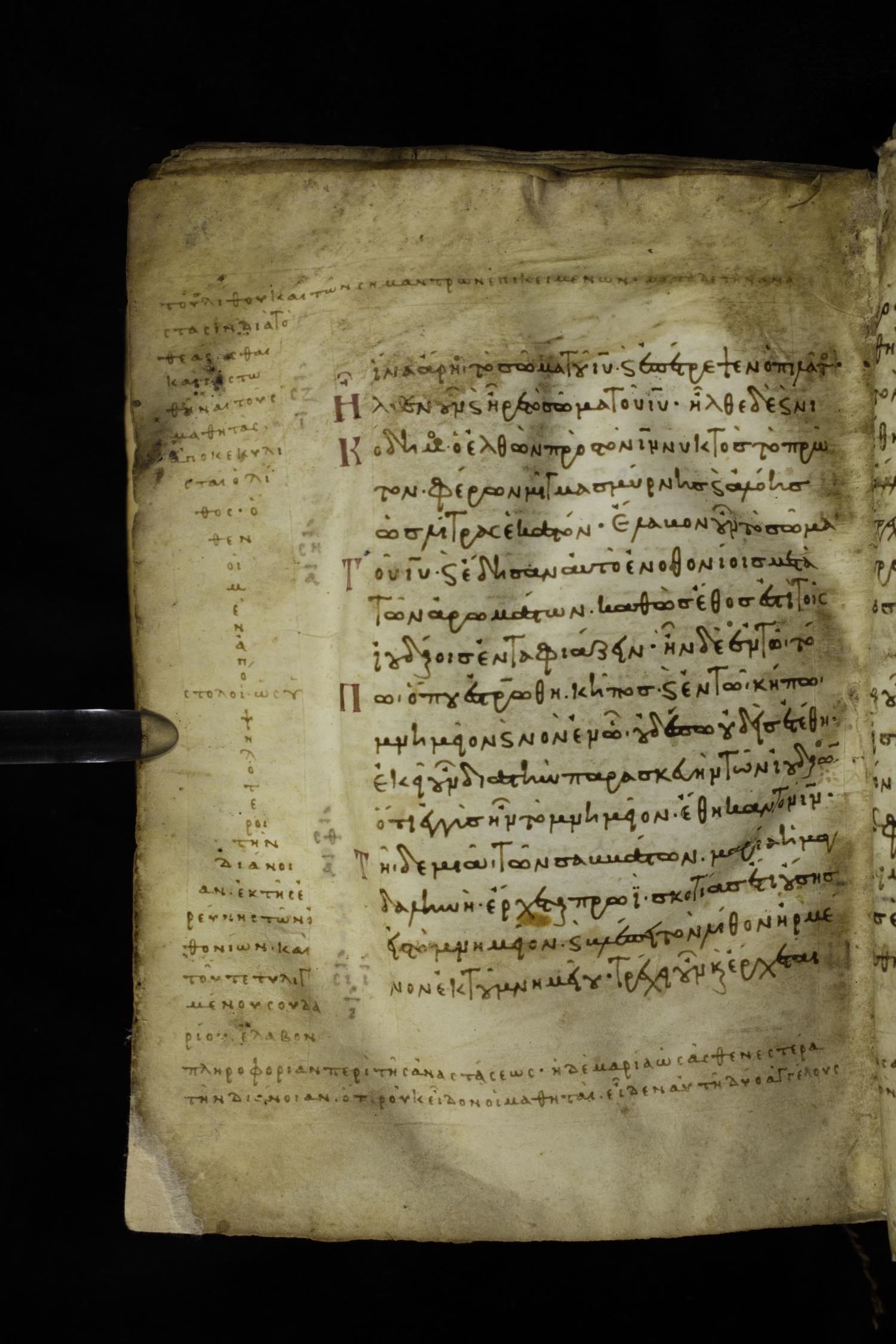 Eleventh century minuscule of the Gospels with commentary on parchment; 289 leaves, single column, 15-17 lines per column. Images were taken at the Hellenic Parliament Library in Athens.
