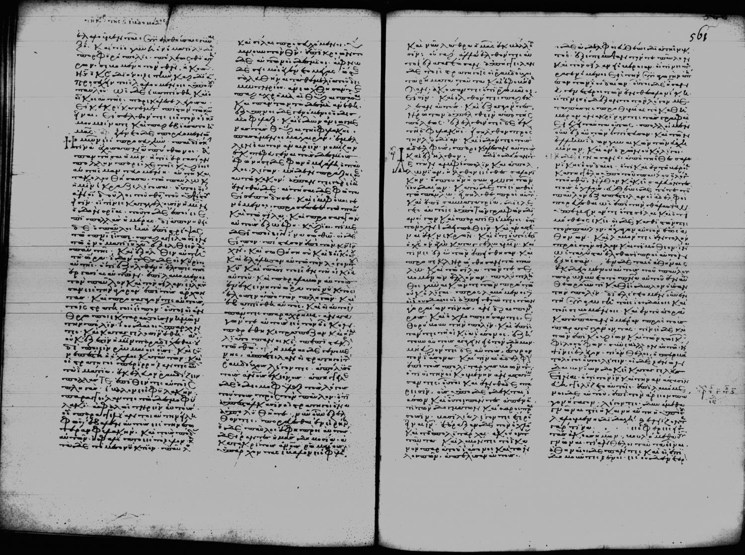 Thirteenth century minuscule of the Gospels, Apostolos, Paul, and Revelation (complete New Testament, with the Old Testament) on parchment; 138 leaves, 2 columns, 50-52 lines per column. The digital microfilm images were generously donated to CSNTM.