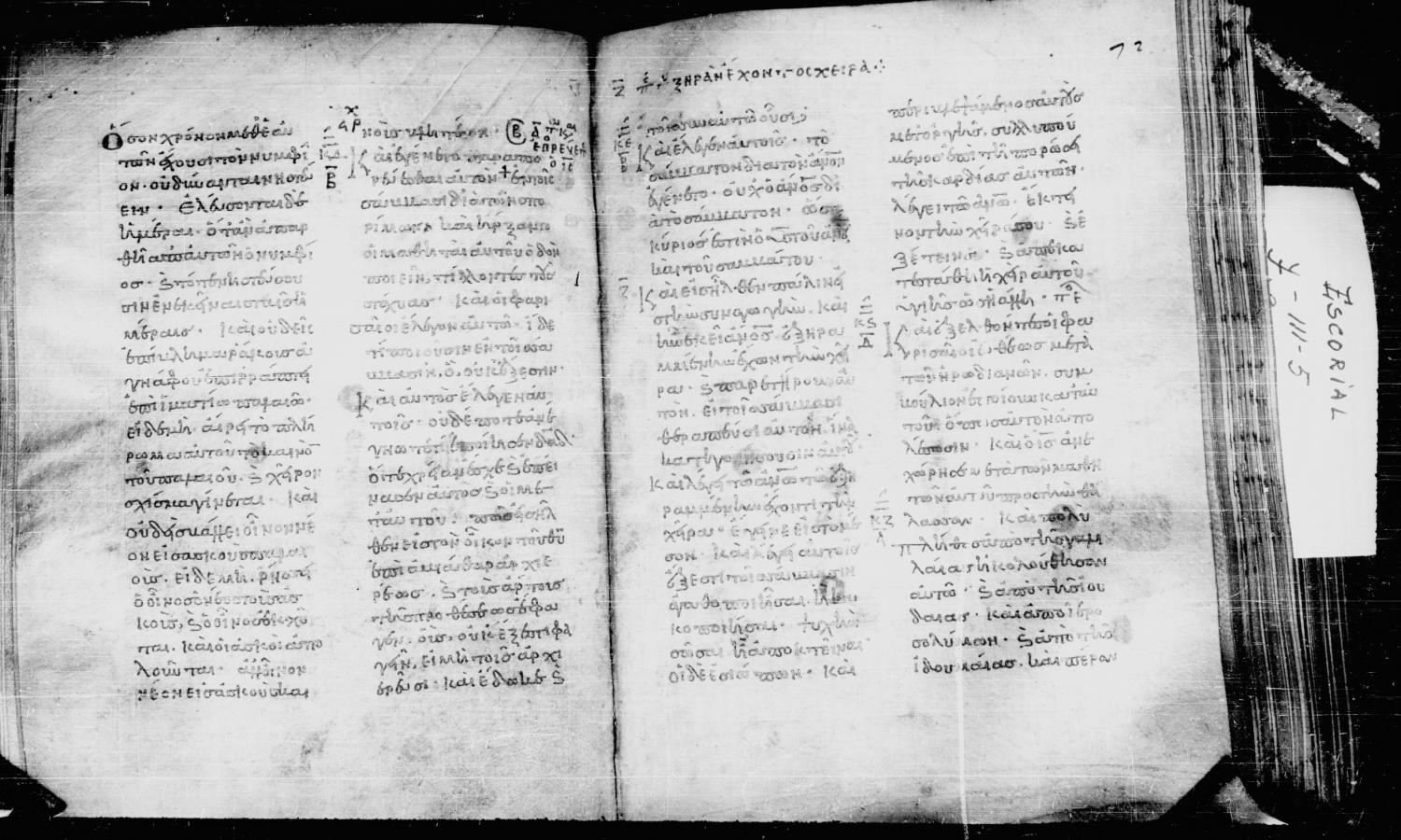 Eleventh century minuscule (dated to 1013) of the Gospels on parchment; 218 leaves, 2 columns, 24 lines per column. Digital images are from microfilm.