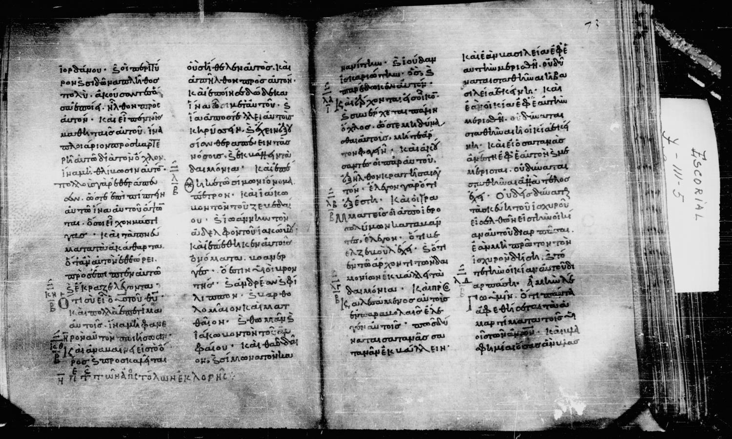 Eleventh century minuscule (dated to 1013) of the Gospels on parchment; 218 leaves, 2 columns, 24 lines per column. Digital images are from microfilm.
