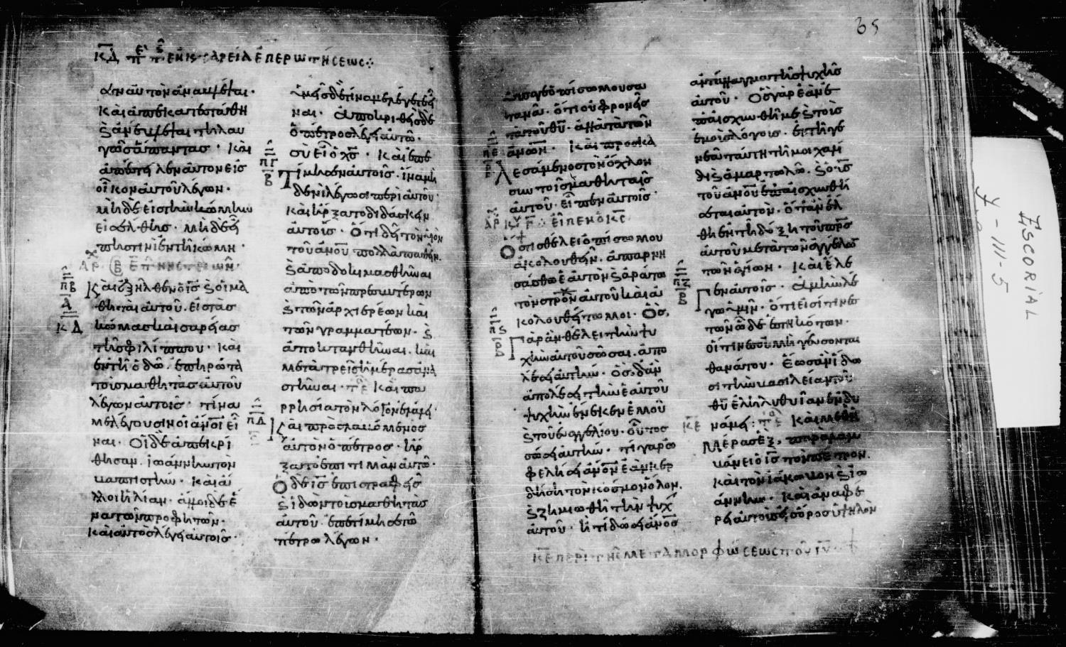 Eleventh century minuscule (dated to 1013) of the Gospels on parchment; 218 leaves, 2 columns, 24 lines per column. Digital images are from microfilm.