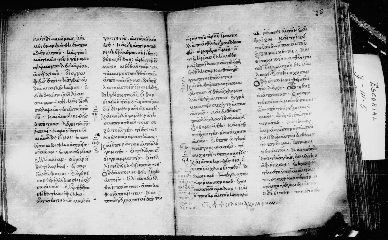 Eleventh century minuscule (dated to 1013) of the Gospels on parchment; 218 leaves, 2 columns, 24 lines per column. Digital images are from microfilm.