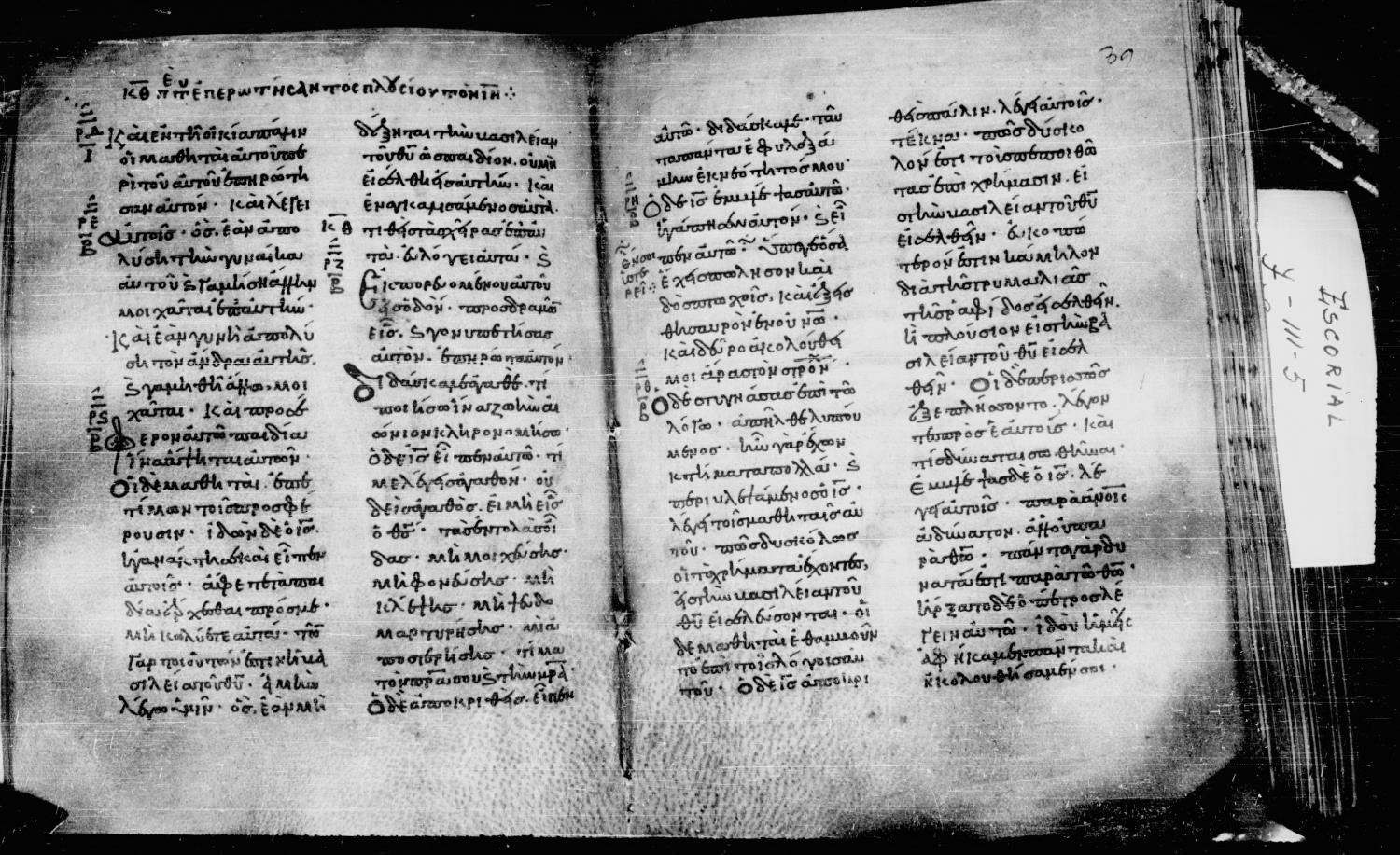 Eleventh century minuscule (dated to 1013) of the Gospels on parchment; 218 leaves, 2 columns, 24 lines per column. Digital images are from microfilm.