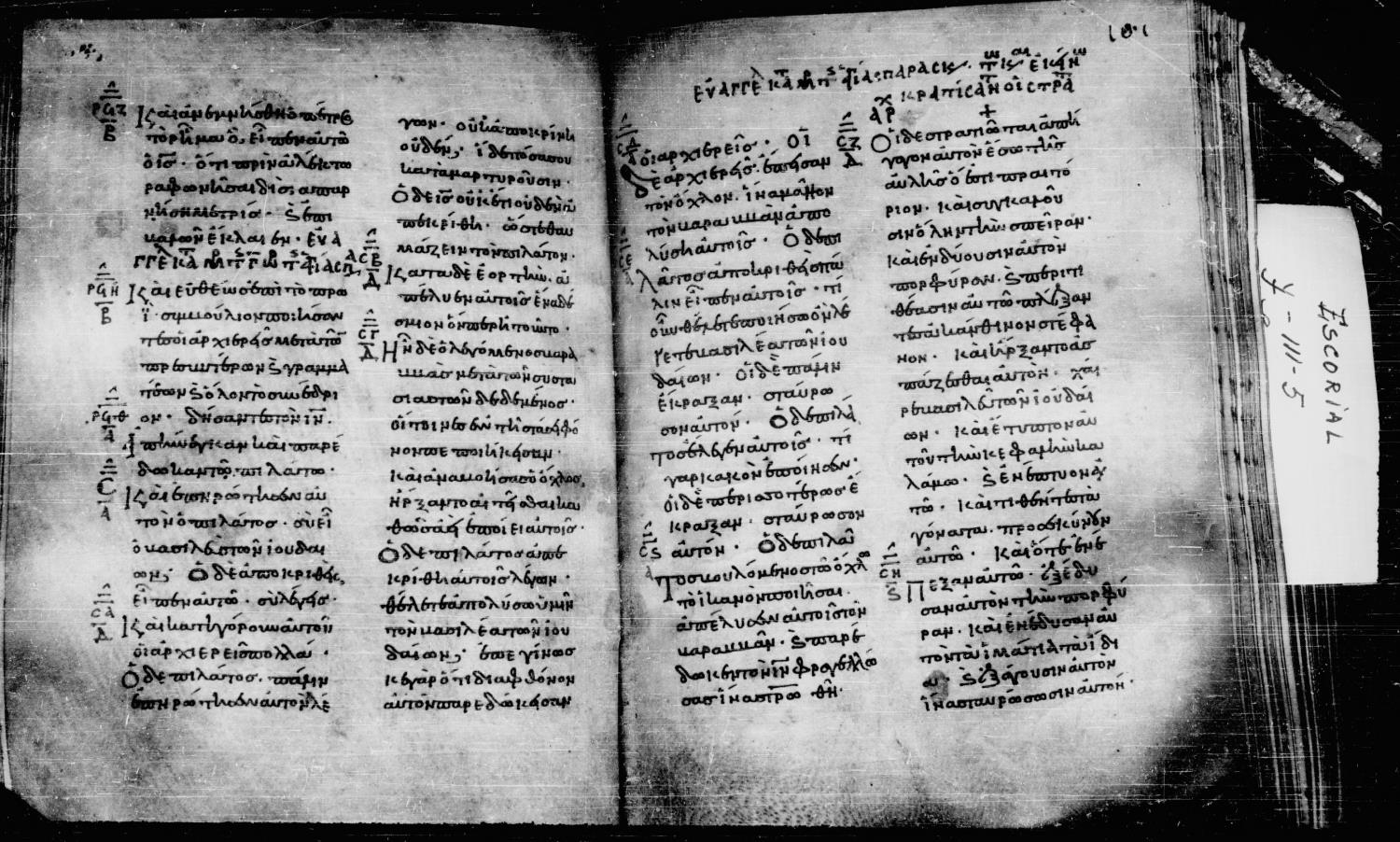 Eleventh century minuscule (dated to 1013) of the Gospels on parchment; 218 leaves, 2 columns, 24 lines per column. Digital images are from microfilm.