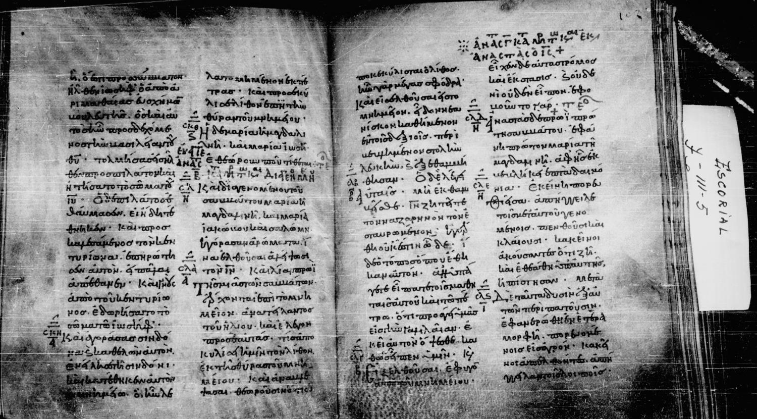 Eleventh century minuscule (dated to 1013) of the Gospels on parchment; 218 leaves, 2 columns, 24 lines per column. Digital images are from microfilm.