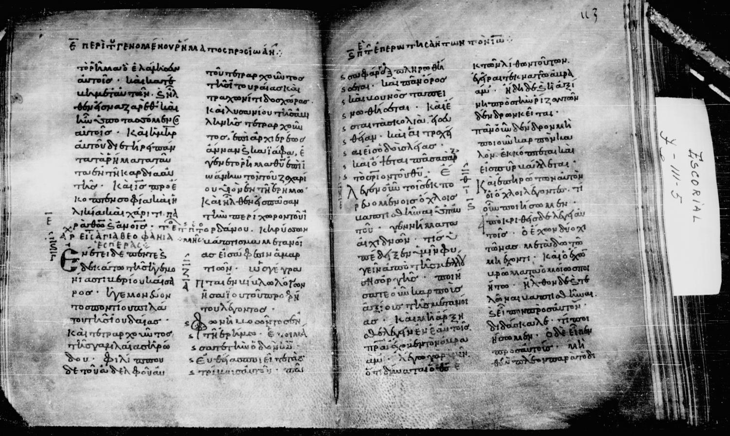Eleventh century minuscule (dated to 1013) of the Gospels on parchment; 218 leaves, 2 columns, 24 lines per column. Digital images are from microfilm.