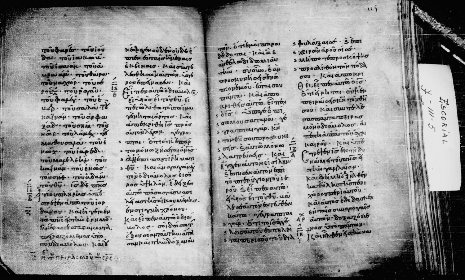 Eleventh century minuscule (dated to 1013) of the Gospels on parchment; 218 leaves, 2 columns, 24 lines per column. Digital images are from microfilm.
