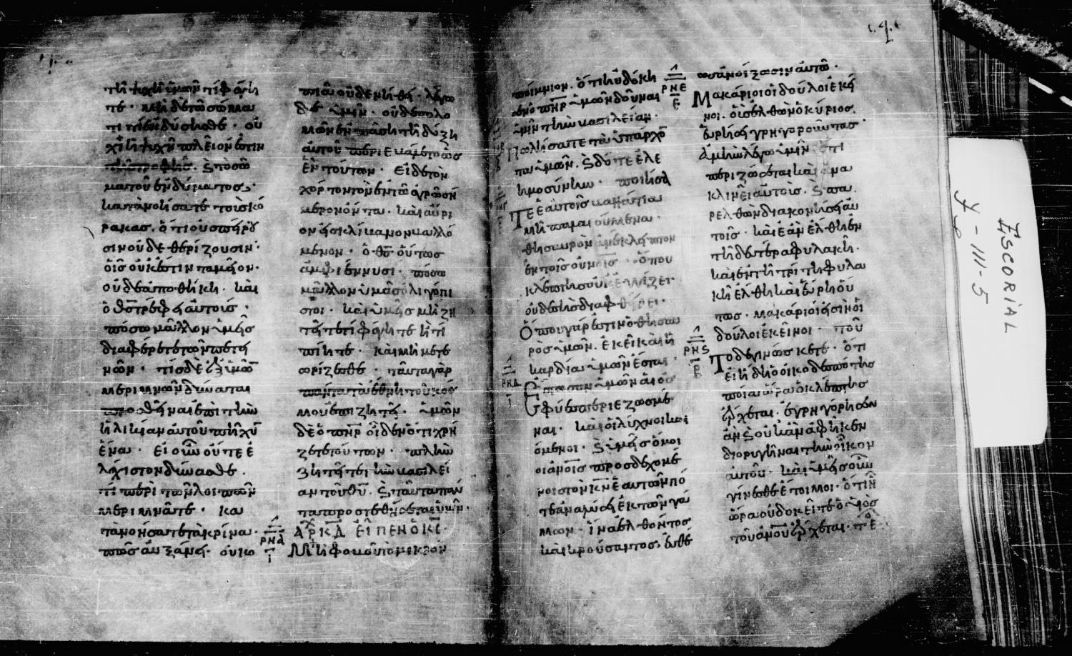 Eleventh century minuscule (dated to 1013) of the Gospels on parchment; 218 leaves, 2 columns, 24 lines per column. Digital images are from microfilm.