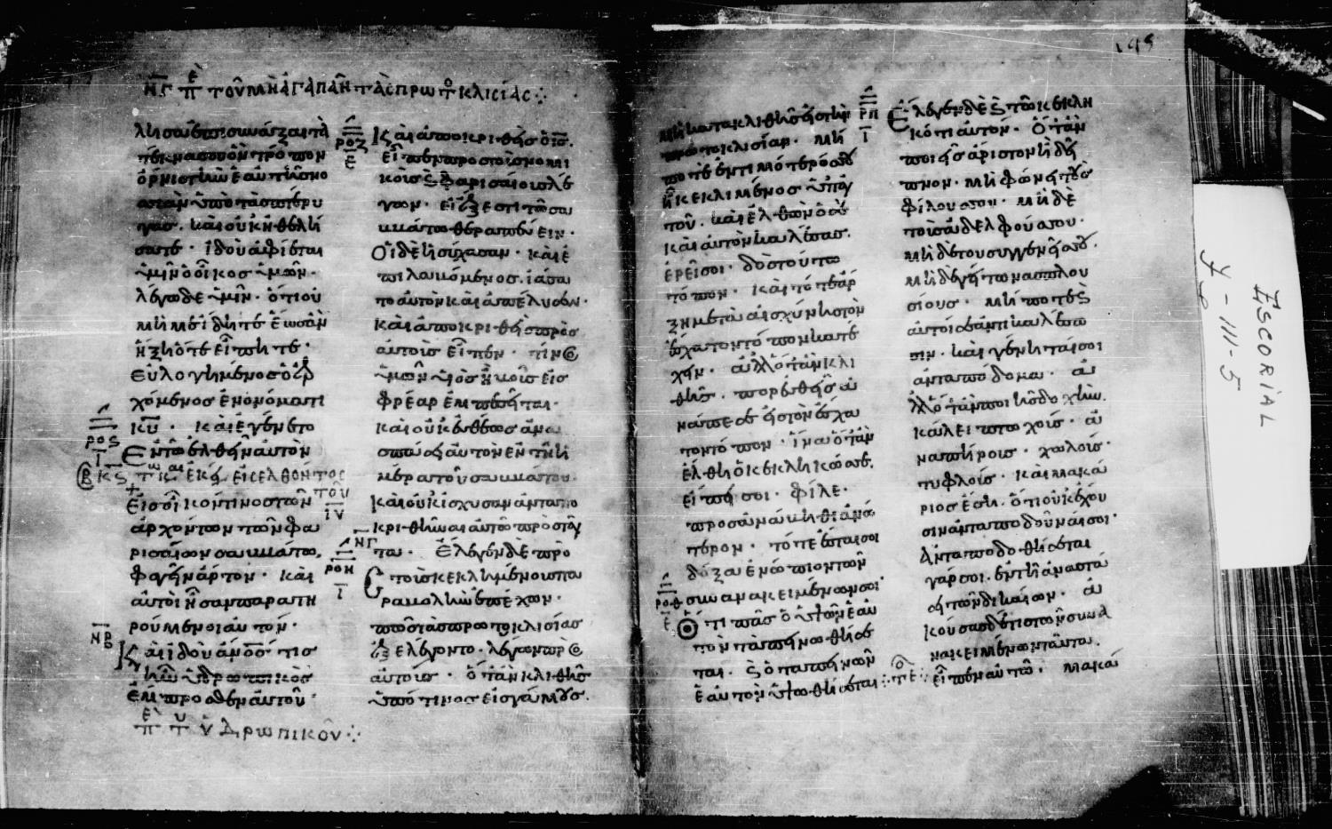 Eleventh century minuscule (dated to 1013) of the Gospels on parchment; 218 leaves, 2 columns, 24 lines per column. Digital images are from microfilm.