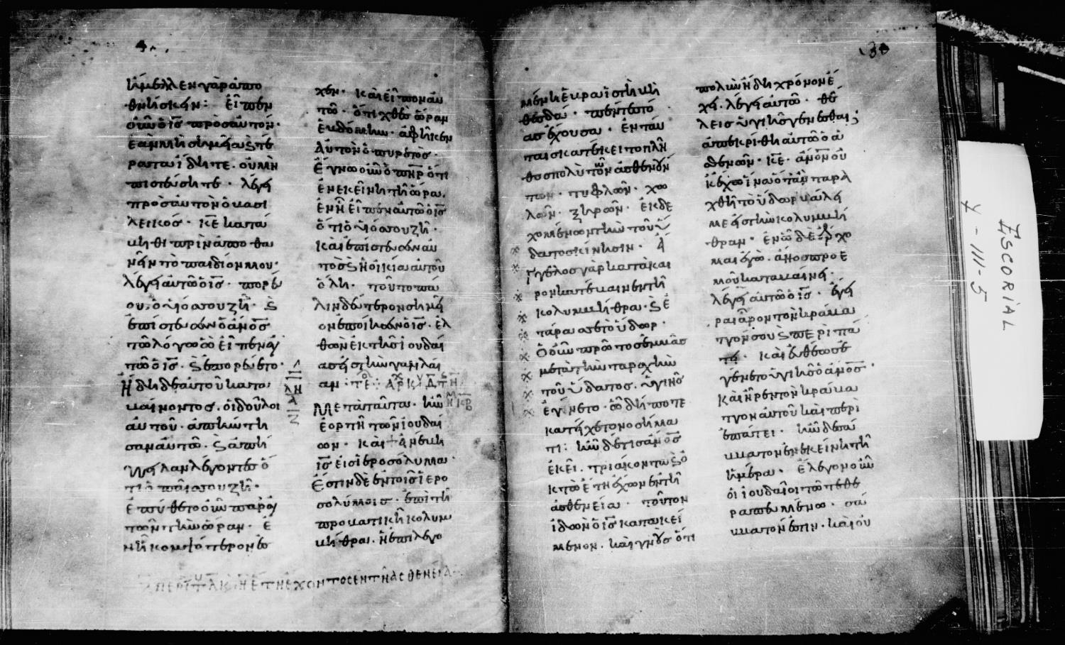Eleventh century minuscule (dated to 1013) of the Gospels on parchment; 218 leaves, 2 columns, 24 lines per column. Digital images are from microfilm.