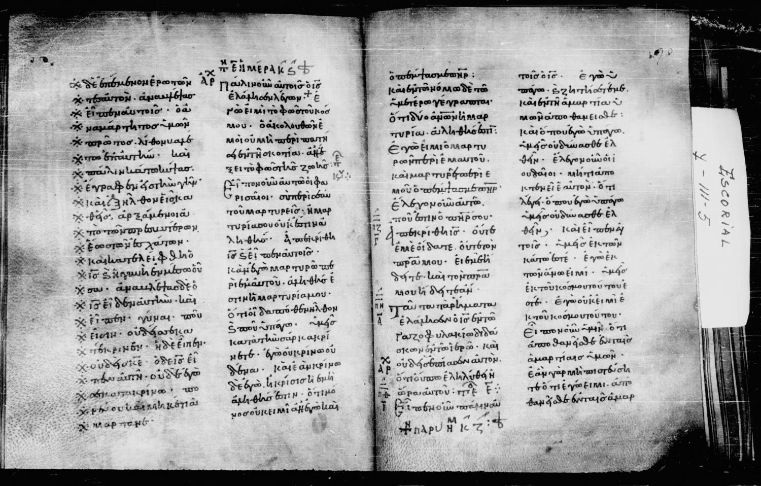 Eleventh century minuscule (dated to 1013) of the Gospels on parchment; 218 leaves, 2 columns, 24 lines per column. Digital images are from microfilm.