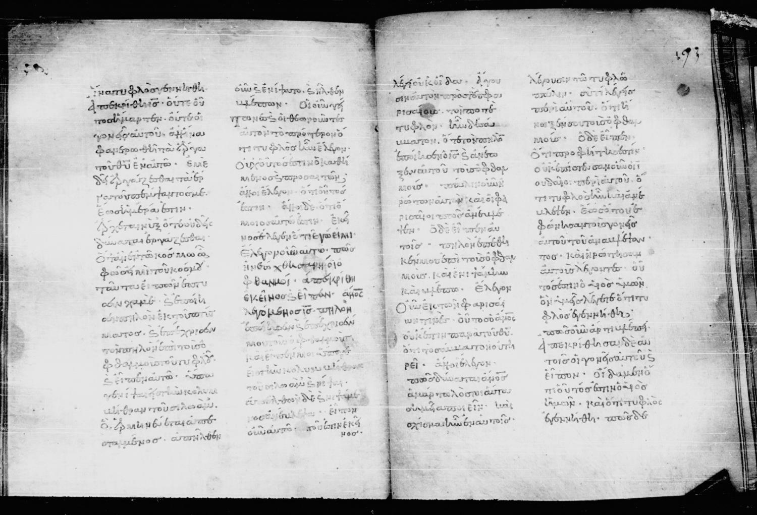 Eleventh century minuscule (dated to 1013) of the Gospels on parchment; 218 leaves, 2 columns, 24 lines per column. Digital images are from microfilm.