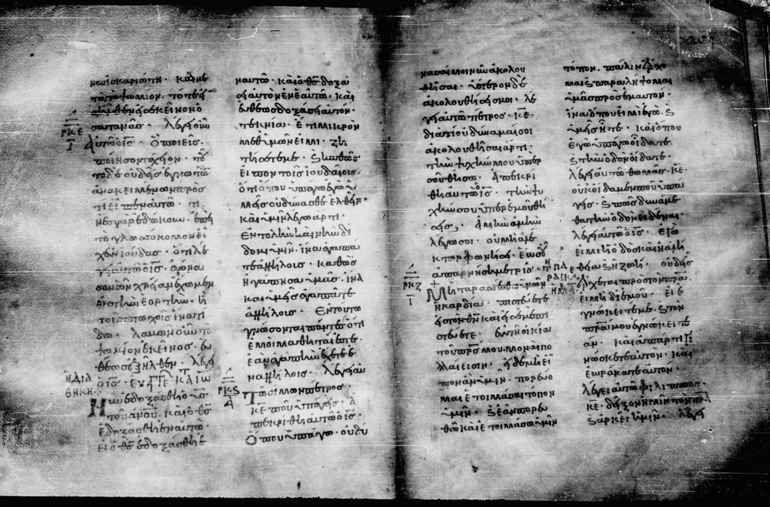 Eleventh century minuscule (dated to 1013) of the Gospels on parchment; 218 leaves, 2 columns, 24 lines per column. Digital images are from microfilm.