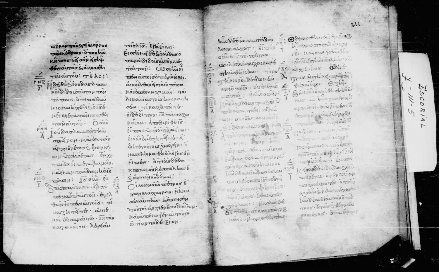 Eleventh century minuscule (dated to 1013) of the Gospels on parchment; 218 leaves, 2 columns, 24 lines per column. Digital images are from microfilm.