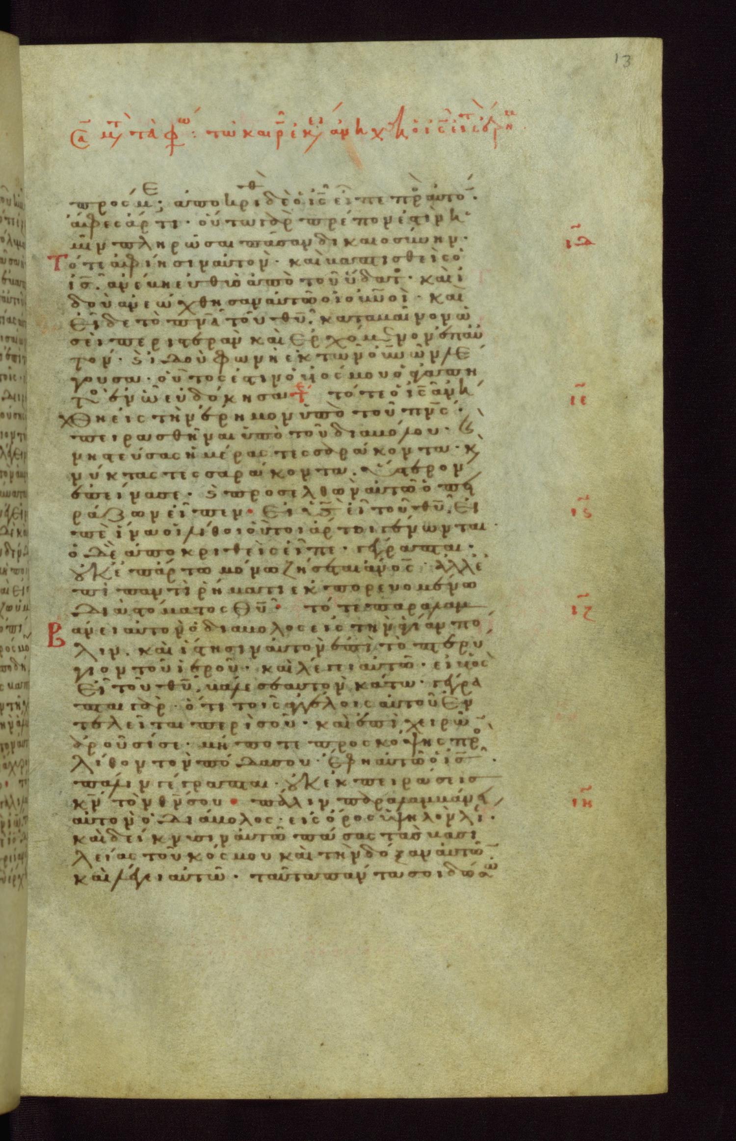Thirteenth to fourteenth century minuscule of the Gospels, Acts, and Paul on parchment. 352 leaves; 1 column per page; 36 lines per column. Images are from the Walters Art Museum and are made available by Creative Commons Attribution Unported 3.0.