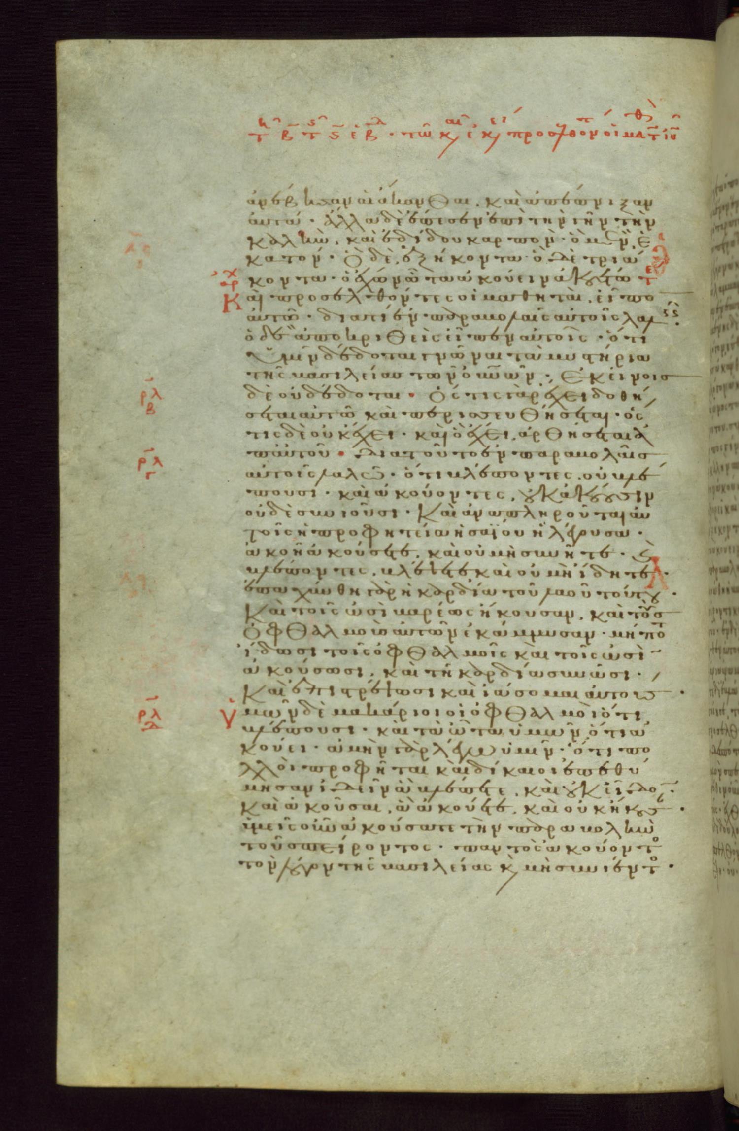 Thirteenth to fourteenth century minuscule of the Gospels, Acts, and Paul on parchment. 352 leaves; 1 column per page; 36 lines per column. Images are from the Walters Art Museum and are made available by Creative Commons Attribution Unported 3.0.