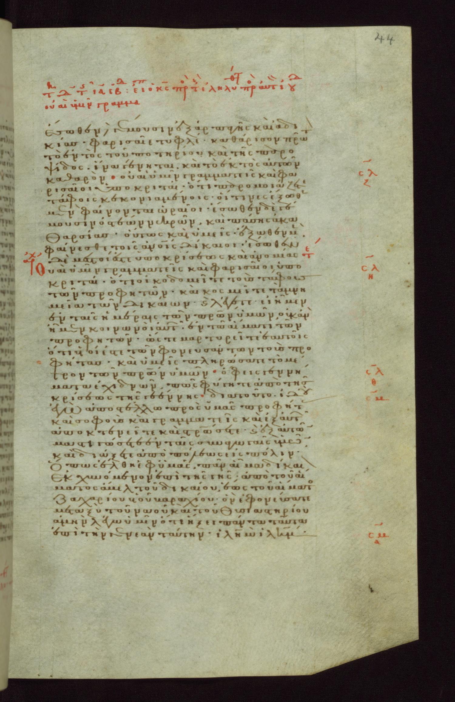 Thirteenth to fourteenth century minuscule of the Gospels, Acts, and Paul on parchment. 352 leaves; 1 column per page; 36 lines per column. Images are from the Walters Art Museum and are made available by Creative Commons Attribution Unported 3.0.
