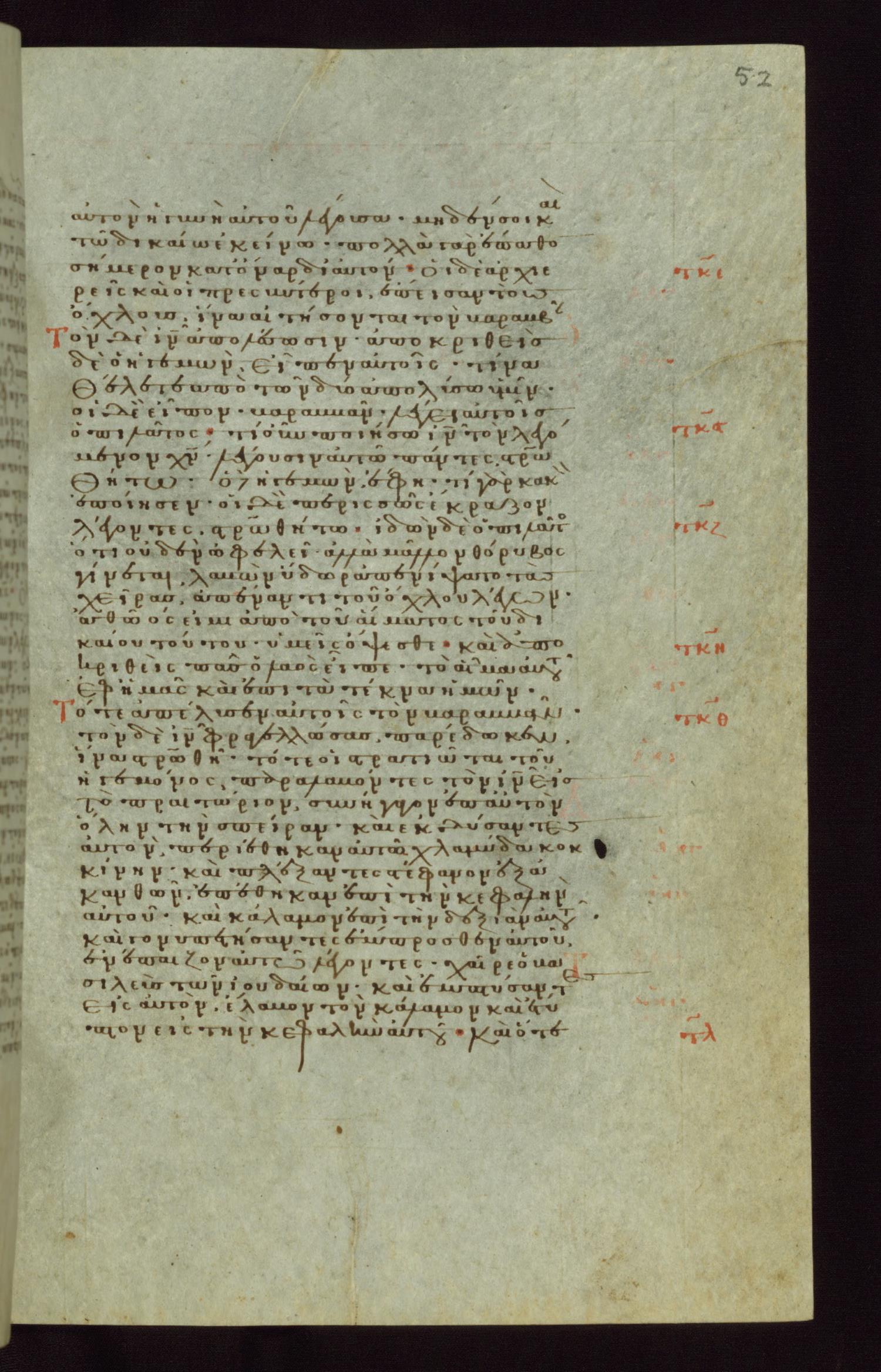 Thirteenth to fourteenth century minuscule of the Gospels, Acts, and Paul on parchment. 352 leaves; 1 column per page; 36 lines per column. Images are from the Walters Art Museum and are made available by Creative Commons Attribution Unported 3.0.