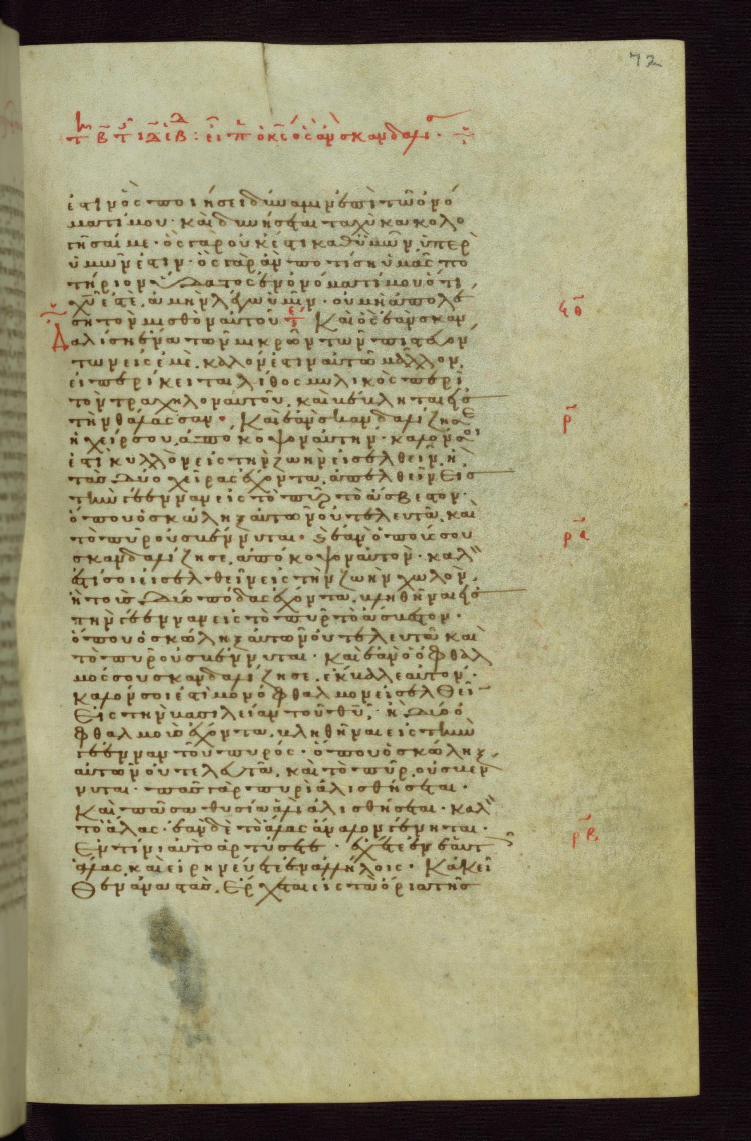 Thirteenth to fourteenth century minuscule of the Gospels, Acts, and Paul on parchment. 352 leaves; 1 column per page; 36 lines per column. Images are from the Walters Art Museum and are made available by Creative Commons Attribution Unported 3.0.