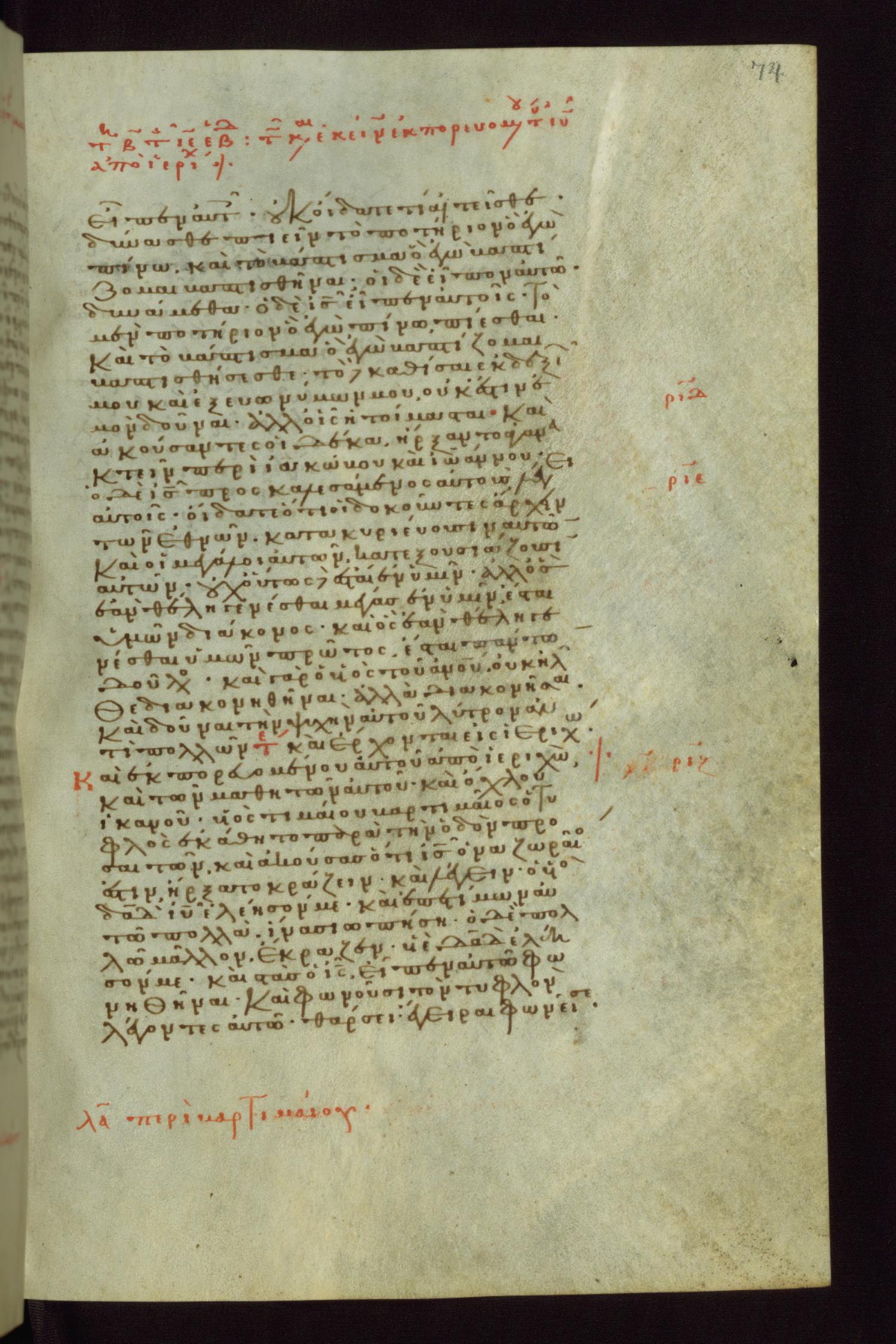 Thirteenth to fourteenth century minuscule of the Gospels, Acts, and Paul on parchment. 352 leaves; 1 column per page; 36 lines per column. Images are from the Walters Art Museum and are made available by Creative Commons Attribution Unported 3.0.
