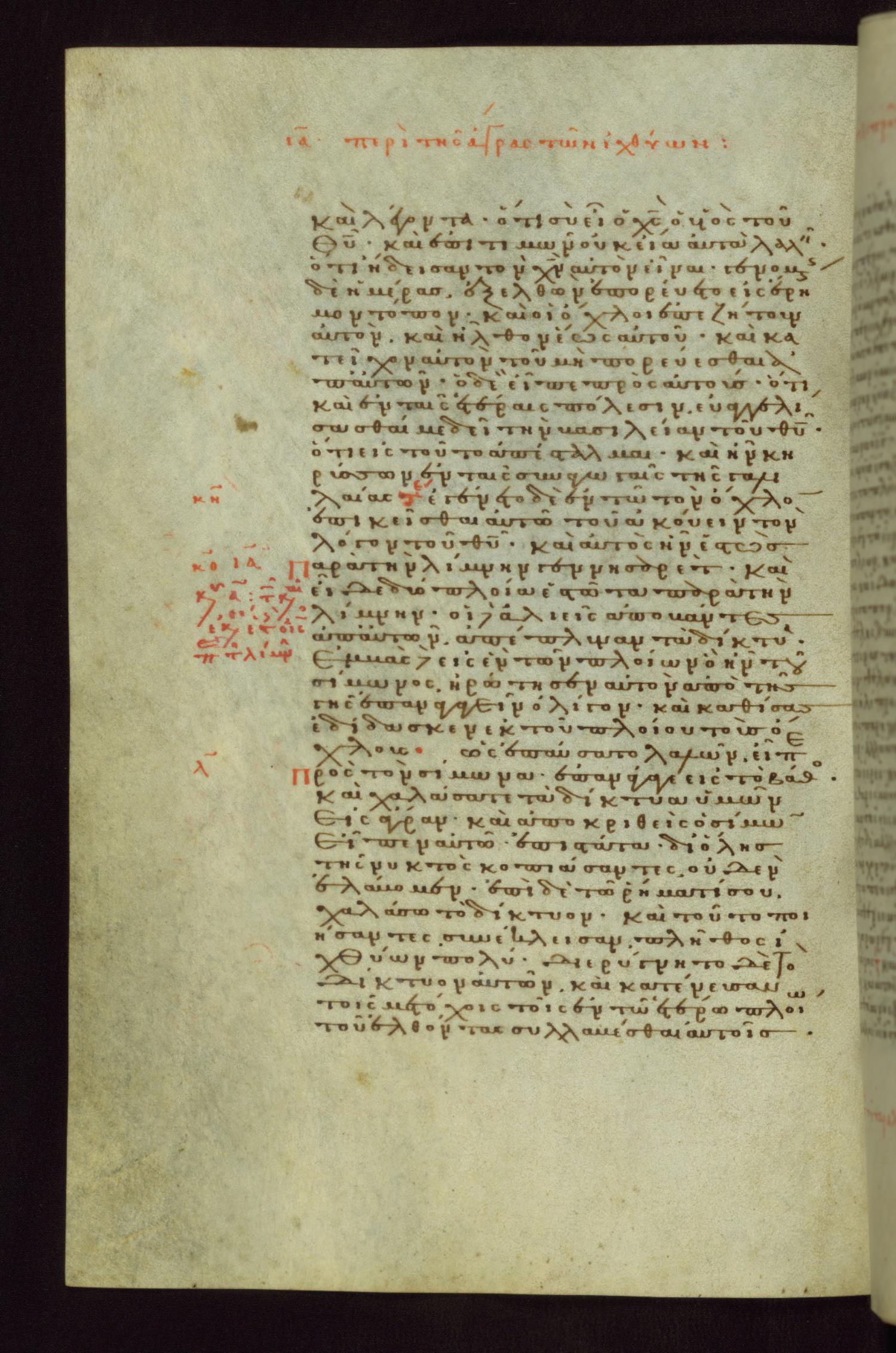 Thirteenth to fourteenth century minuscule of the Gospels, Acts, and Paul on parchment. 352 leaves; 1 column per page; 36 lines per column. Images are from the Walters Art Museum and are made available by Creative Commons Attribution Unported 3.0.