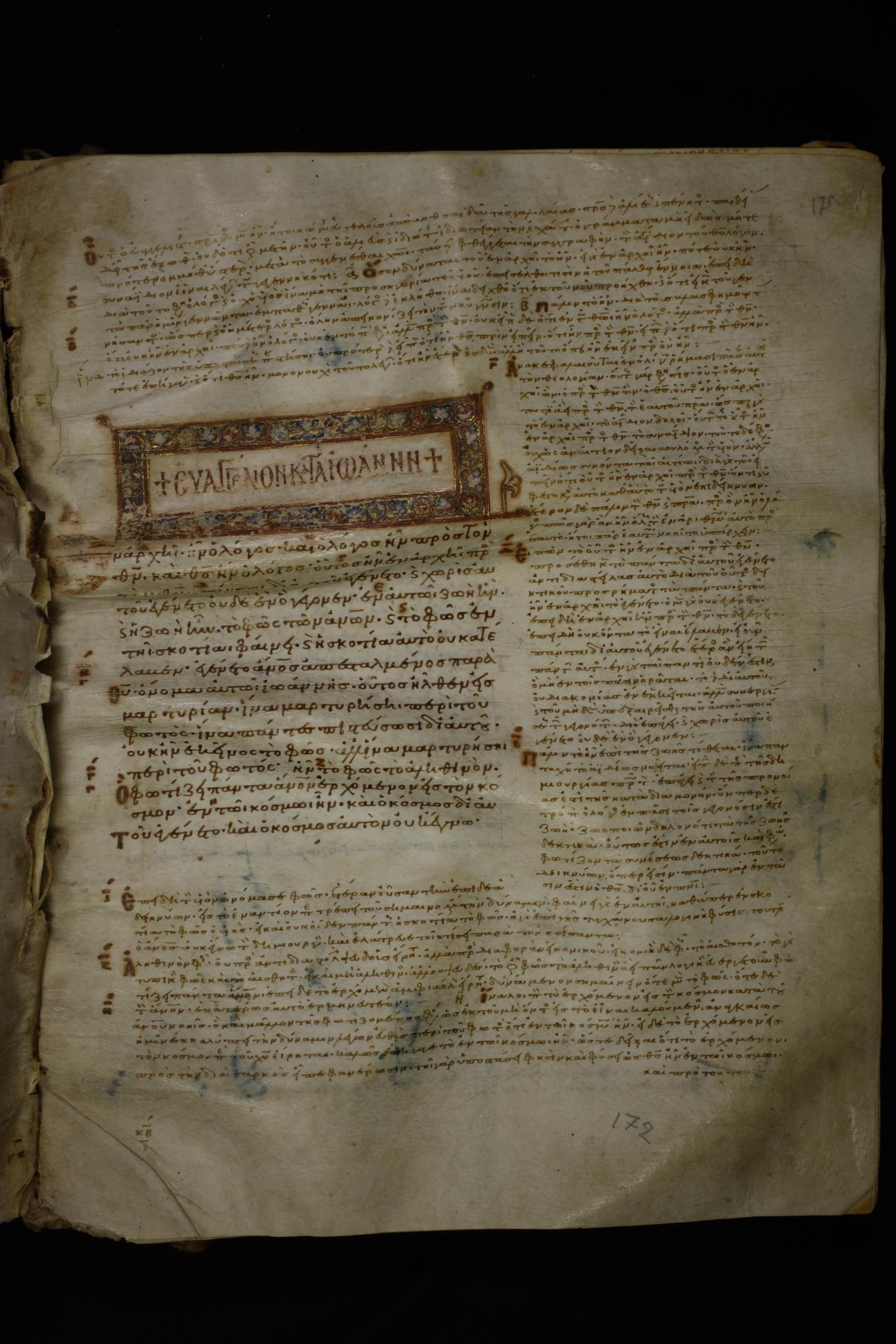 Tenth century manuscript of the Gospels with commentary on parchment; 215 leaves, single column, c. 17-26 lines per column.