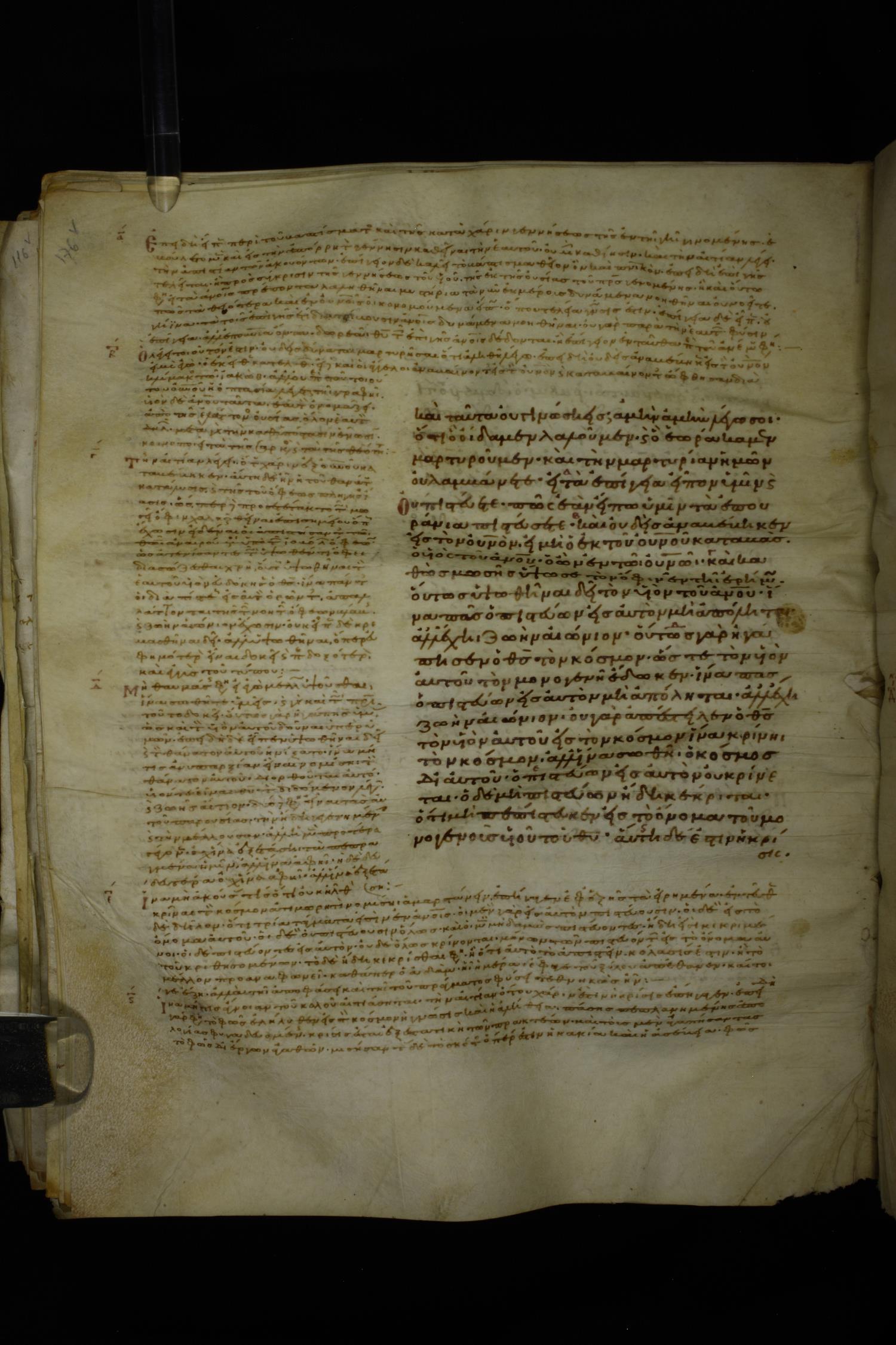 Tenth century manuscript of the Gospels with commentary on parchment; 215 leaves, single column, c. 17-26 lines per column.