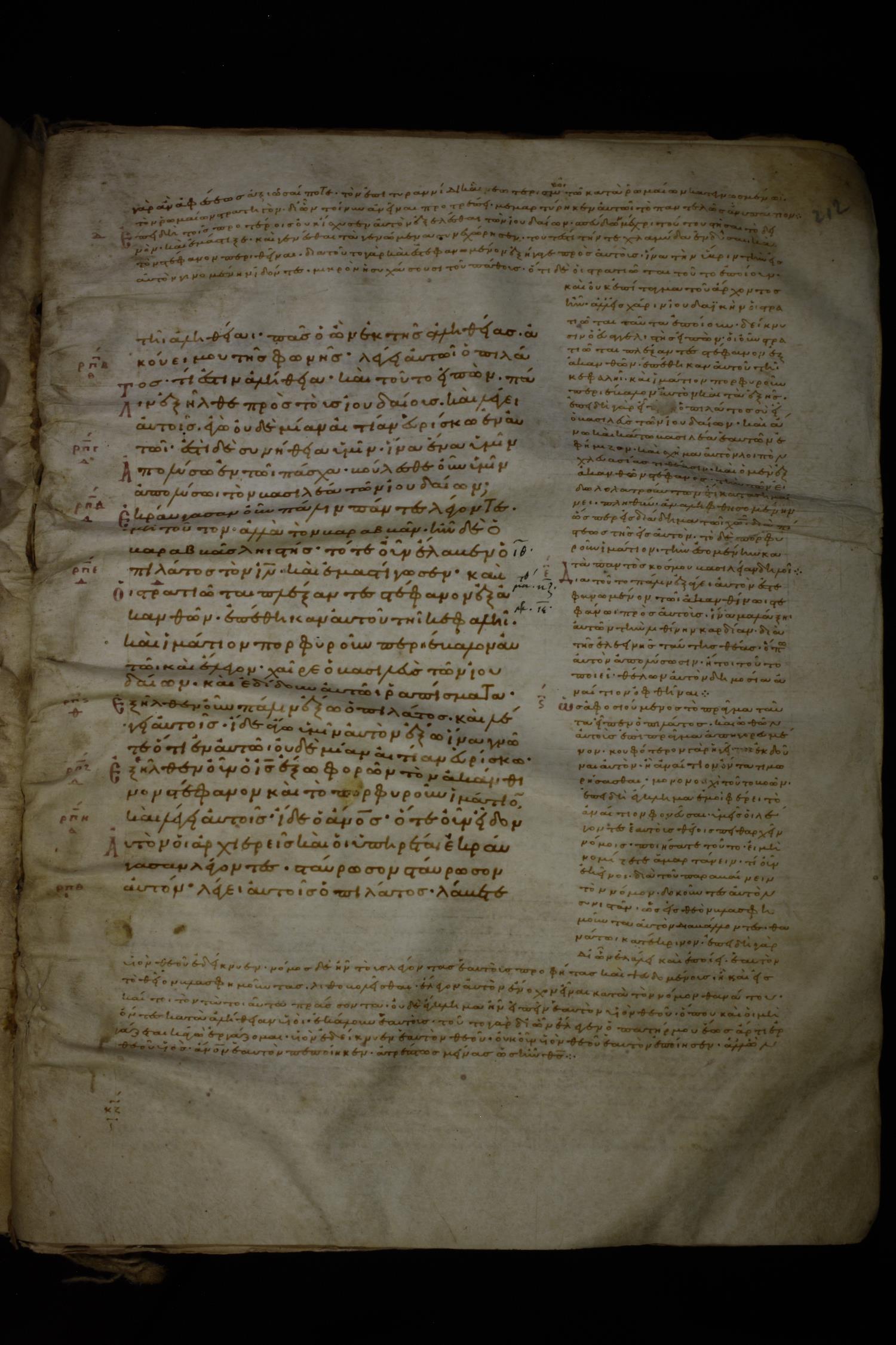 Tenth century manuscript of the Gospels with commentary on parchment; 215 leaves, single column, c. 17-26 lines per column.