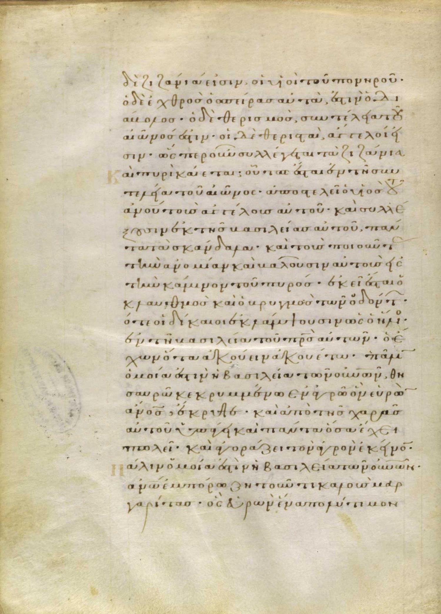 Ὁμοία ἐστὶν ἡ βασιλεία τῶν οὐρανῶν θησαυρῷ κεκρυμμένῳ ἐν τῷ ἀγρῷ, ὃν εὑρὼν ἄνθρωπος ἔκρυψεν, καὶ ἀπὸ τῆς χαρᾶς αὐτοῦ ὑπάγει καὶ πωλεῖ {πάντα} ὅσα ἔχει καὶ ἀγοράζει τὸν ἀγρὸν ἐκεῖνον.