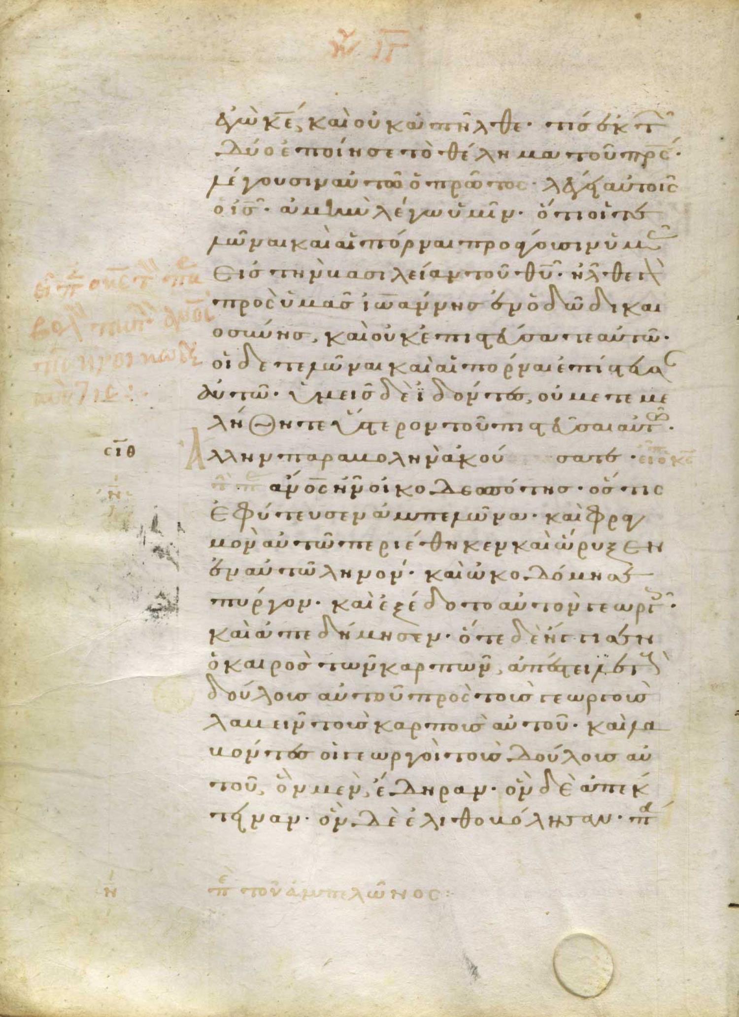 Ἄλλην παραβολὴν ἀκούσατε. Ἄνθρωπος ἦν οἰκοδεσπότης ὅστις ἐφύτευσεν ἀμπελῶνα καὶ φραγμὸν αὐτῷ περιέθηκεν καὶ ὤρυξεν ἐν αὐτῷ ληνὸν καὶ ᾠκοδόμησεν πύργον, καὶ ἐξέδετο αὐτὸν γεωργοῖς, καὶ ἀπεδήμησεν.