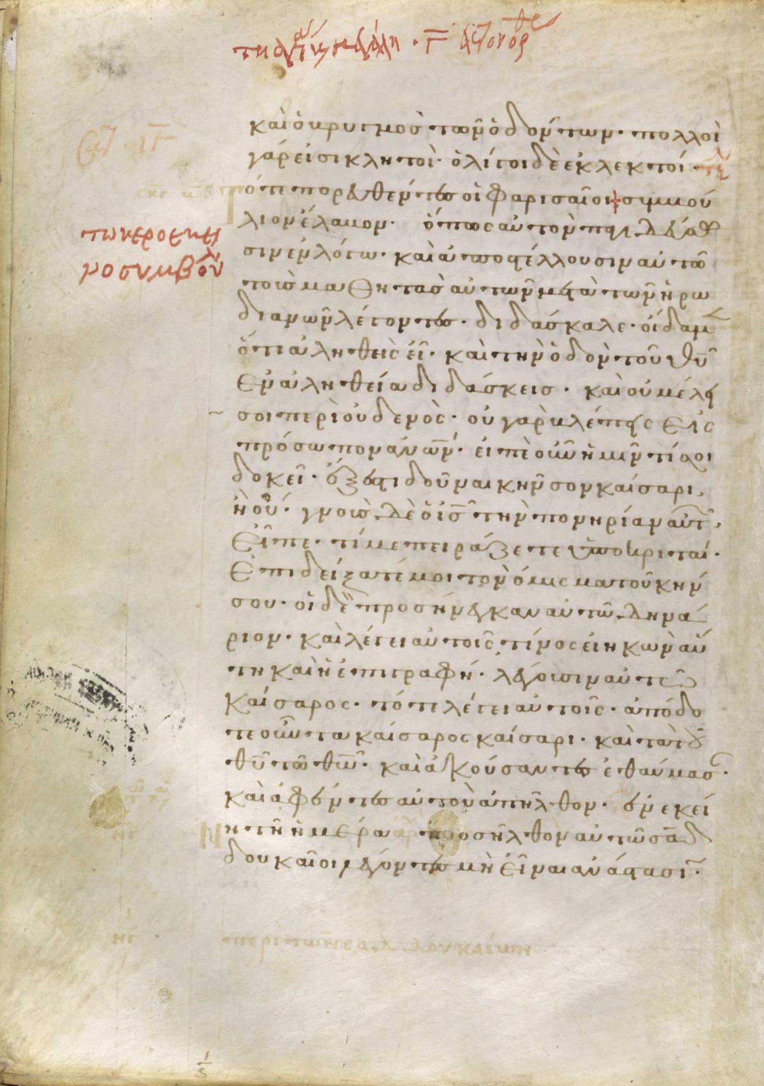 καὶ ἀποστέλλουσιν αὐτῷ τοὺς μαθητὰς αὐτῶν μετὰ τῶν Ἡρῳδιανῶν λέγοντας / λέγοντες Διδάσκαλε, οἴδαμεν ὅτι ἀληθὴς εἶ καὶ τὴν ὁδὸν τοῦ θεοῦ ἐν ἀληθείᾳ διδάσκεις, καὶ οὐ μέλει σοι περὶ οὐδενός, οὐ γὰρ βλέπεις εἰς πρόσωπον ἀνθρώπων·