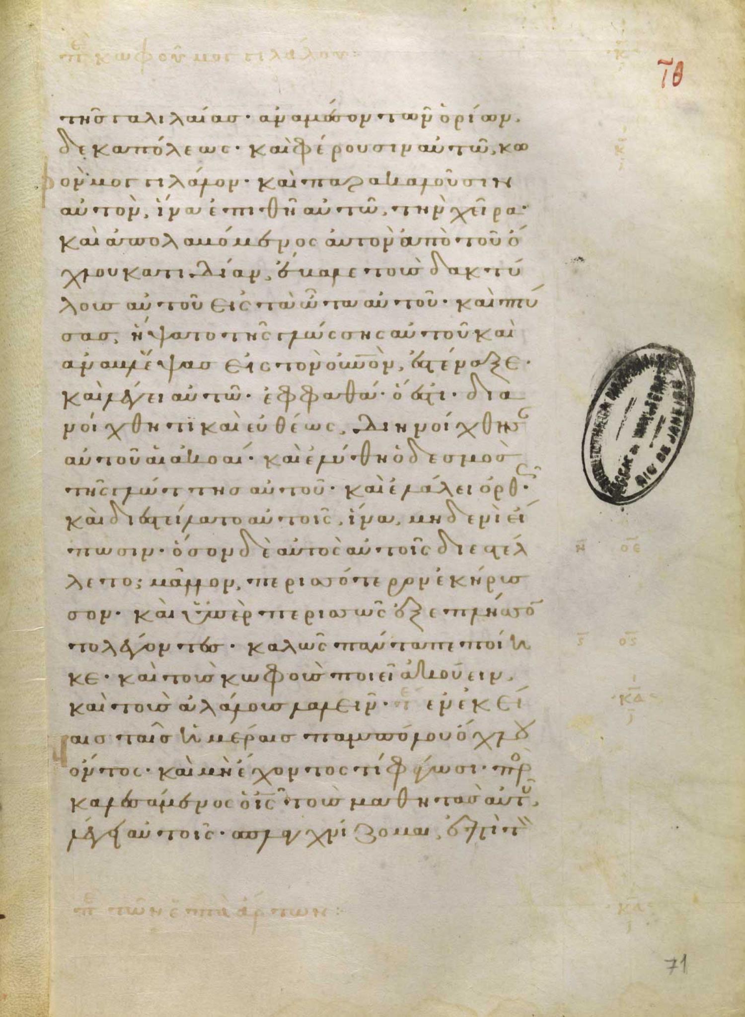 Ἐν ἐκείναις ταῖς ἡμέραις πάλιν πολλοῦ ὄχλου ὄντος καὶ μὴ ἐχόντων τί φάγωσιν, προσκαλεσάμενος τοὺς μαθητὰς λέγει αὐτοῖς