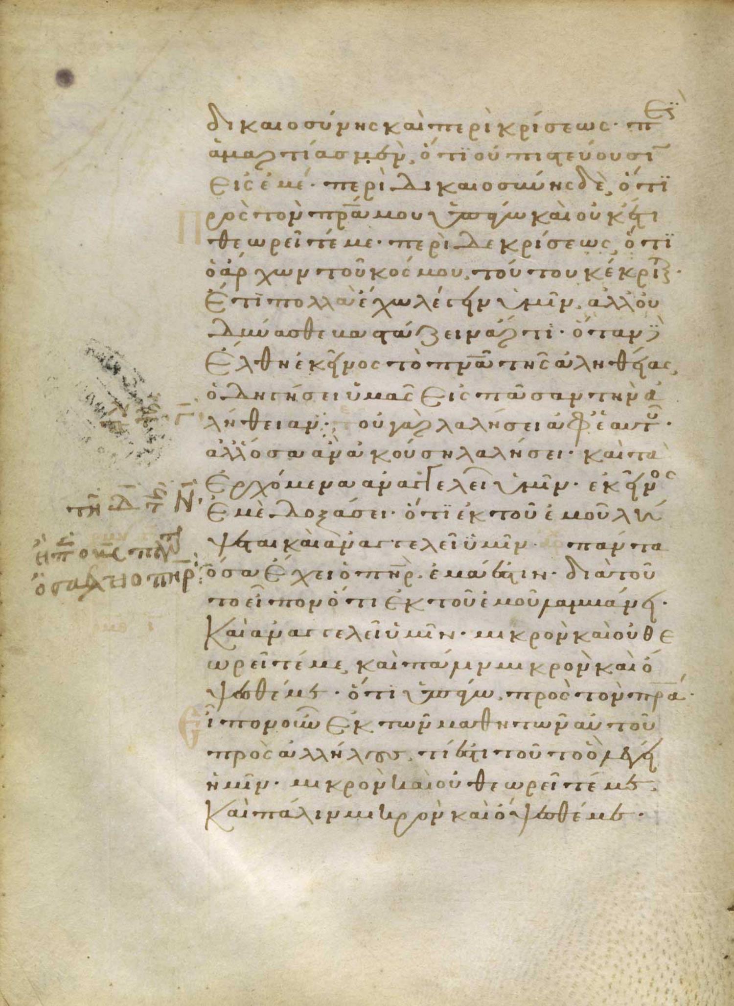 Καὶ ἐλθὼν ἐκεῖνος ἐλέγξει τὸν κόσμον περὶ ἁμαρτίας καὶ περὶ δικαιοσύνης καὶ περὶ κρίσεως·