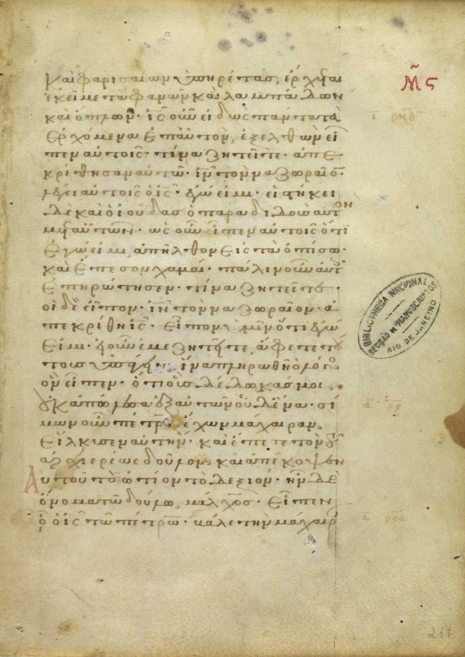 Eleventh or twelfth century minuscule of the Gospels on parchment; 220 leaves, single column, 24 lines per column.