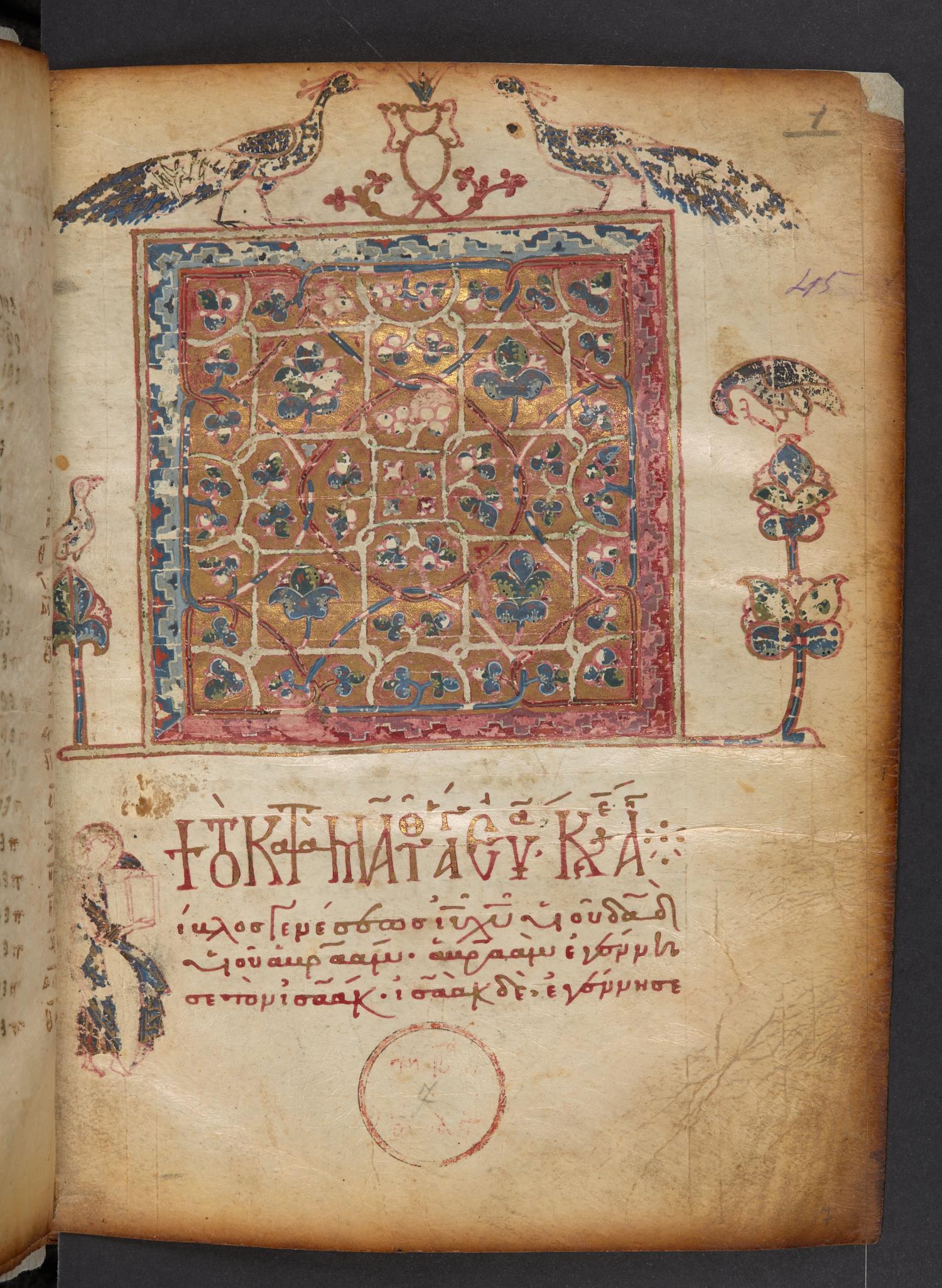 ΒΙΒΛΟΣ γενέσεως Ἰησοῦ Χριστοῦ υἱοῦ Δαυεὶδ / Δαυὶδ υἱοῦ Ἀβραάμ.