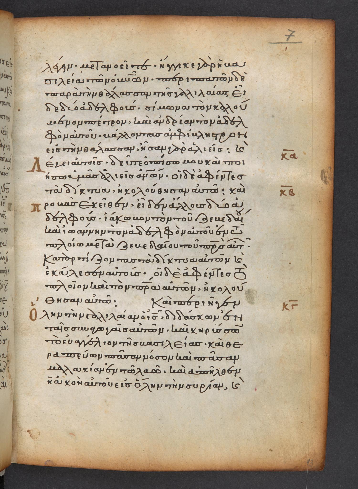 Twelfth to thirteenth-century minuscule of the Gospels on parchment; 224 leaves, 1 column, 24 lines per column. These public domain images are made available by the National Library of Poland. For more information and recent digital images visit Polona.
