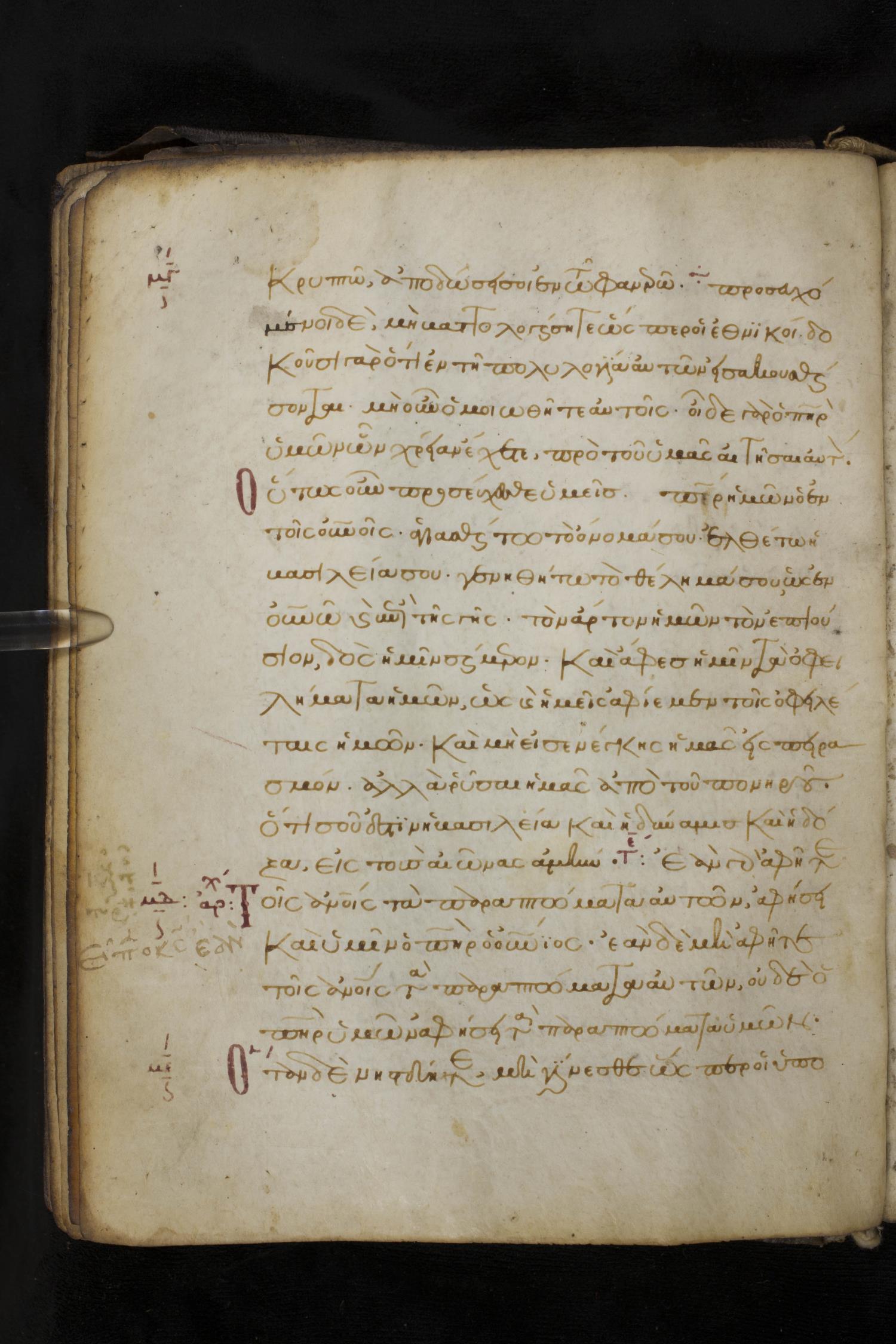 Thirteenth century minuscule of the Gospels on parchment; 172 leaves, 1 column, 20-30 lines per column. Images were taken at the National Library of Greece in Athens.