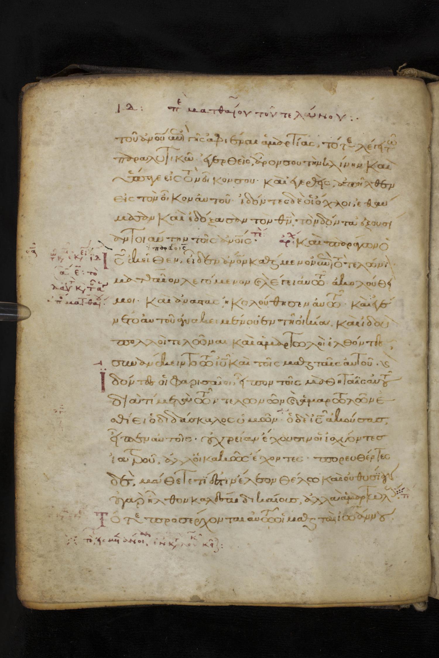Thirteenth century minuscule of the Gospels on parchment; 172 leaves, 1 column, 20-30 lines per column. Images were taken at the National Library of Greece in Athens.