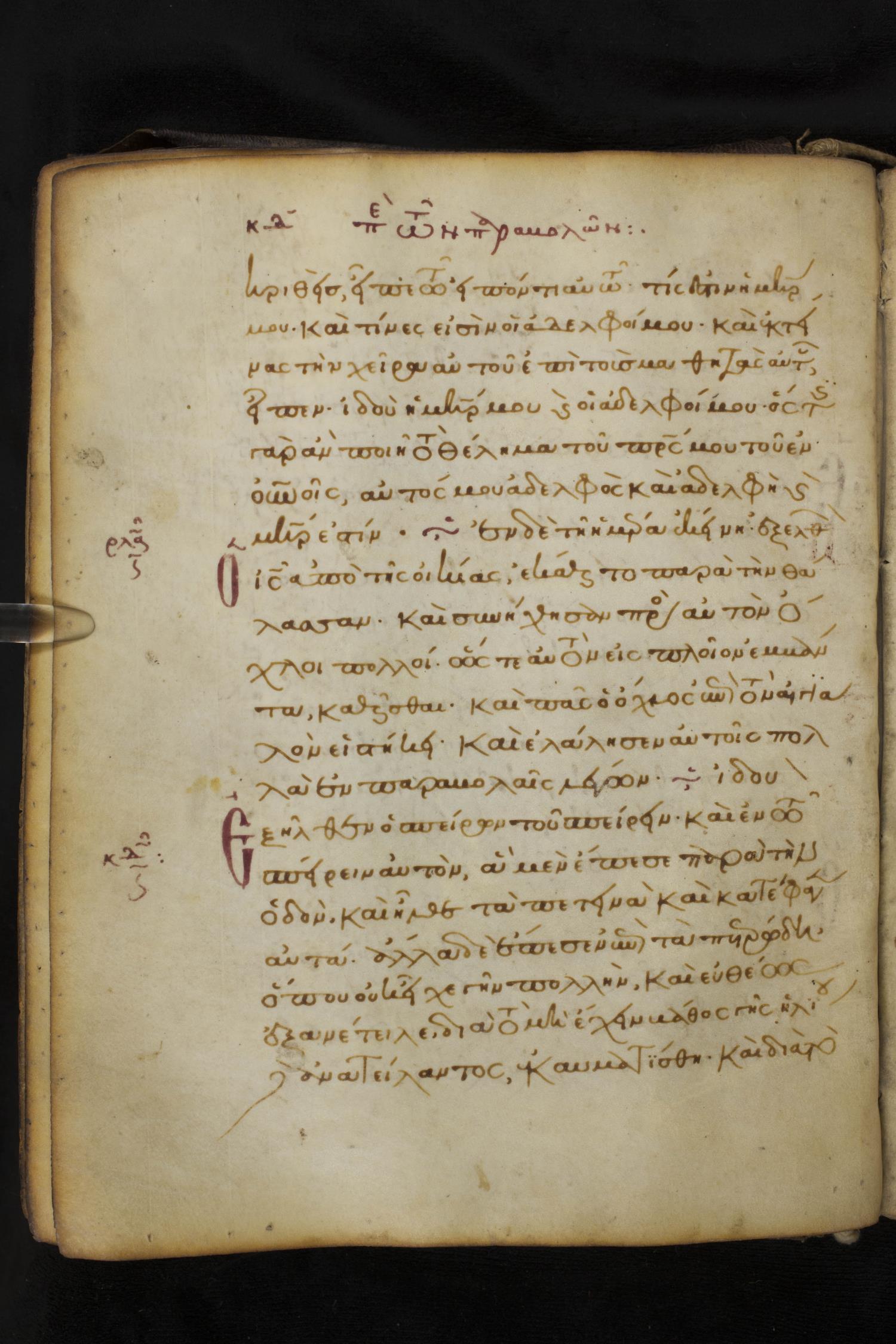 Thirteenth century minuscule of the Gospels on parchment; 172 leaves, 1 column, 20-30 lines per column. Images were taken at the National Library of Greece in Athens.