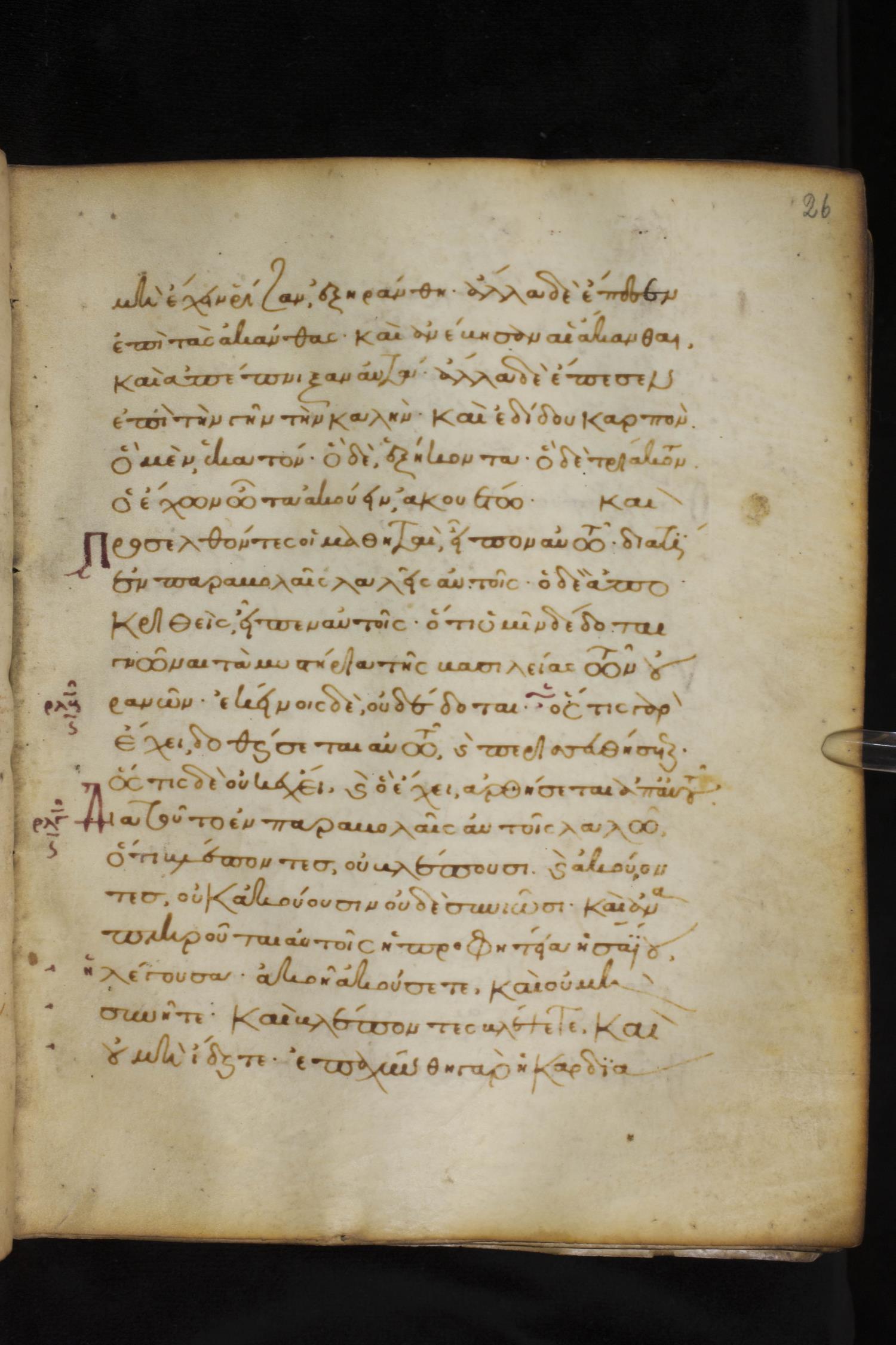 Thirteenth century minuscule of the Gospels on parchment; 172 leaves, 1 column, 20-30 lines per column. Images were taken at the National Library of Greece in Athens.