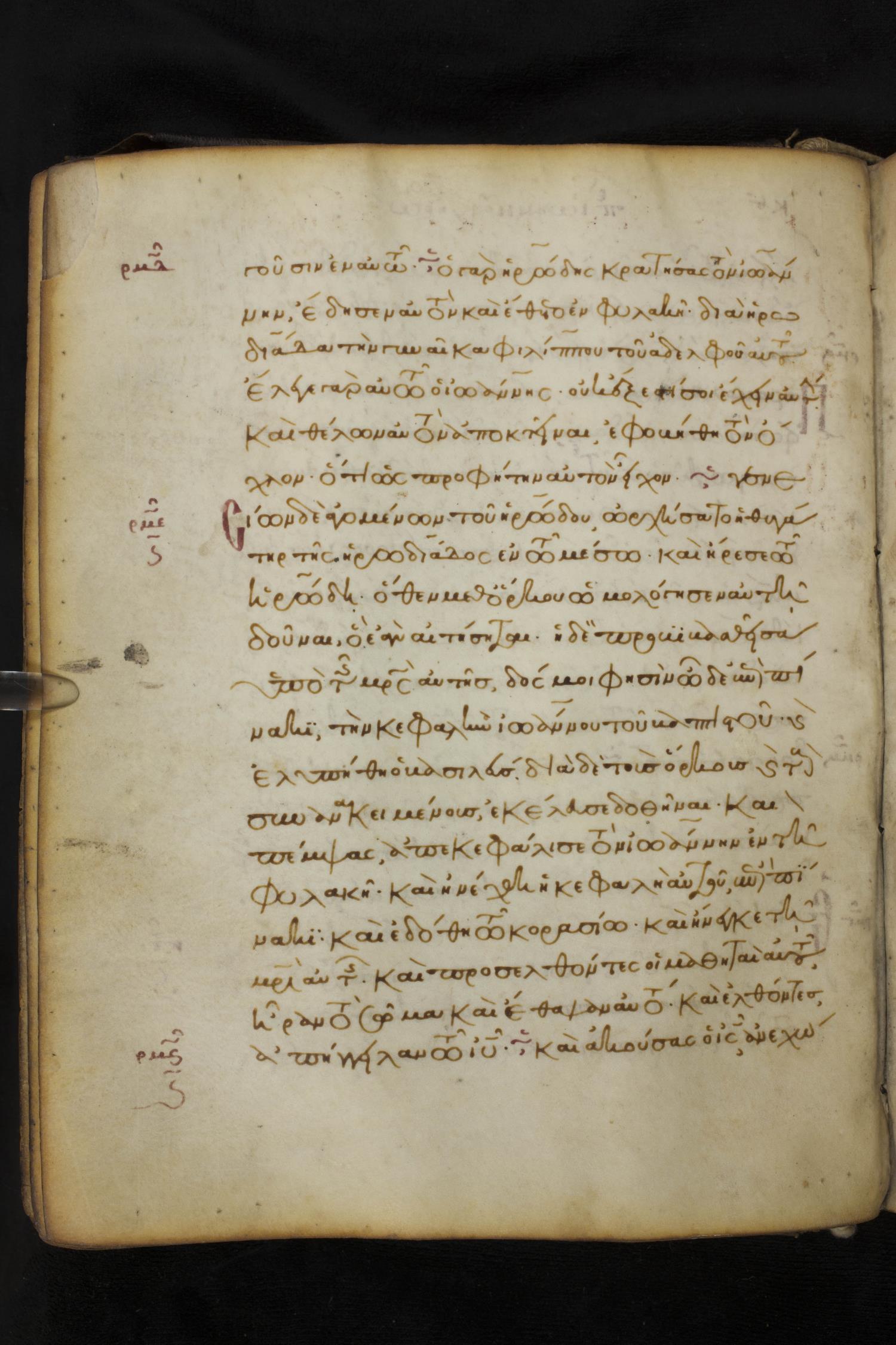 Thirteenth century minuscule of the Gospels on parchment; 172 leaves, 1 column, 20-30 lines per column. Images were taken at the National Library of Greece in Athens.