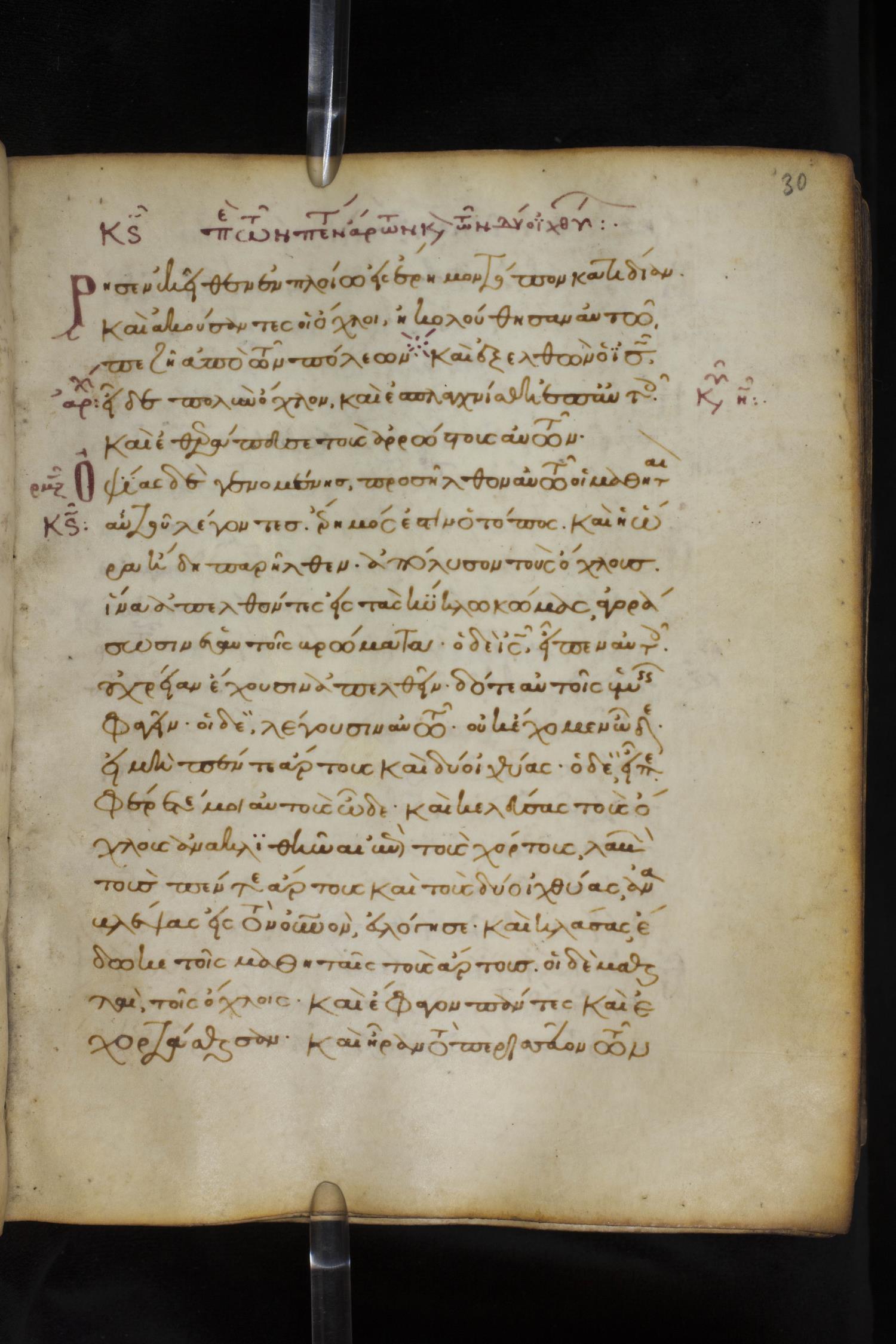Thirteenth century minuscule of the Gospels on parchment; 172 leaves, 1 column, 20-30 lines per column. Images were taken at the National Library of Greece in Athens.