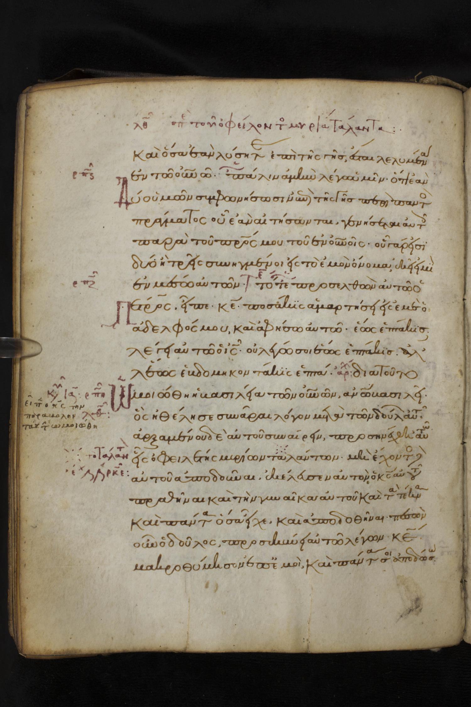 Thirteenth century minuscule of the Gospels on parchment; 172 leaves, 1 column, 20-30 lines per column. Images were taken at the National Library of Greece in Athens.
