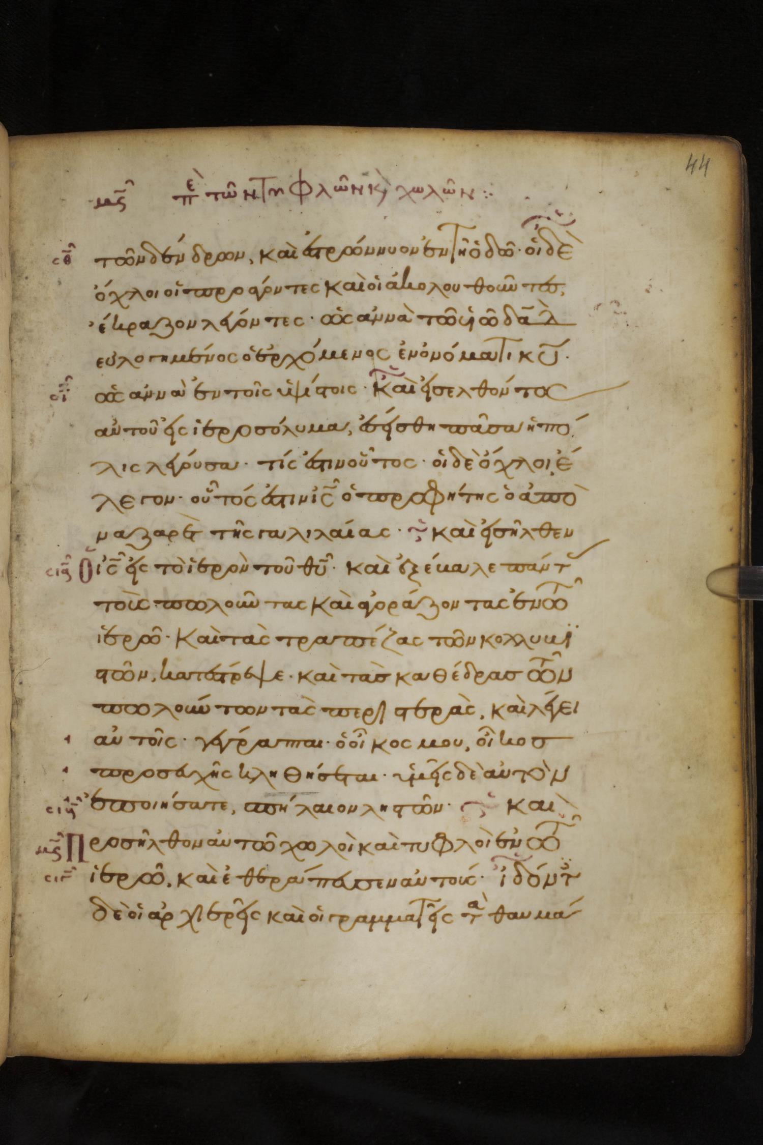 Thirteenth century minuscule of the Gospels on parchment; 172 leaves, 1 column, 20-30 lines per column. Images were taken at the National Library of Greece in Athens.